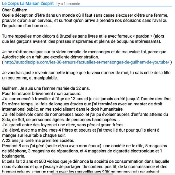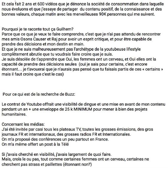 -Je suis une femme, tout comme n'importe quel homme j'ai le droit a.... Si tu a le droit, ne le justifie pas agit comme tel. -J'ai fais des études ... Ca n'a rien avoir, a part montrer qu'avoir un master en droit ne te permet pas d'écrire tes questions sans l'influence d'un youtubeur, ni même arrivé a avoir un esprit critique. -Je suis issu de l'immigration, mais qu'est ce que l'on s'en fou? Tu es française, agit comme tel. Combien de personne ont ni frere, ni pere, grandissent dans des cité etc... et ne cherchent pas a justifie a chaque fois d'ou ils viennent. -Les autres youtubeurs masculin ont plus de livre que moi etc... Suffit de voir la chaine des autres youtubeurs, ils parlent de livres, d'écologie etc... on reproduit donc la chaine. Faire une vidéo ou tu te lave pas, ne semble pas donner un esprit litteraire a ton plateau. -Les Twix, la question n'es pas de poison ou autres. Ils sont dans un hotel, les hotels porposent a leurs VIP ces produits etc... -J'ai gerée une societé de textile, magasin d'e-gig etc... En cherchant son nom, je ne trouve aucun SIREN, peut être que quelqu'un y arrivera. Mais etre vendeuse dans une boulangerie ne signifie pas en etre le manageur.