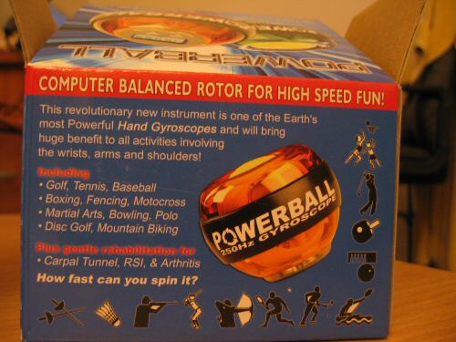 En tout cas ca tue bien le bras ! Et pour les personnes qui se demandent à quoi ca peut bien servir, la réponse : ![]() Utilisé par des chiropracteurs, cette balle est l'instrument idéal pour se fortifier la main, le poignet, le bras et l'avant bras jusqu'à l'épaule. De nombreux sportifs (golfeur, tennismen, escrimeurs) comme de nombreuses professions (batteurs, guitaristes, bouchers, masseurs) se servent donc de la PowerBall pour affermir leurs muscles des bras.