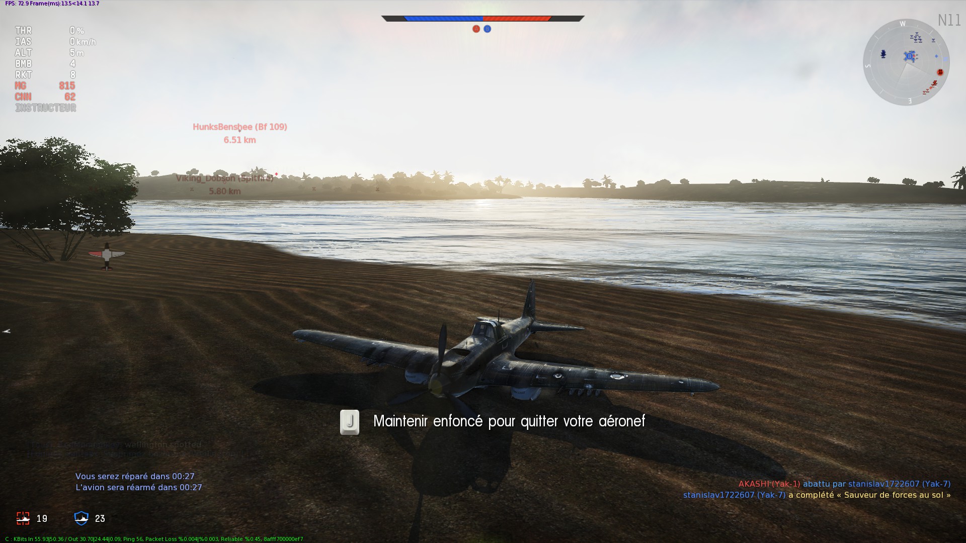 Ah oui, effectivement, là je dois m'incliner!:-o Sinon, quand je disais que les avions russes sont increvables... ![]() Ils sont aussi insubmersible! J'ai réussi à revenir de la zone de combats, sans moteur, avec les gouvernes de profondeurs endommagées, me poser sur l'eau, surfer jusqu'à la plage et m’arrêter pile à la limite de la zone de réparation de l'aérodrome! Gros moment de stress quand même...