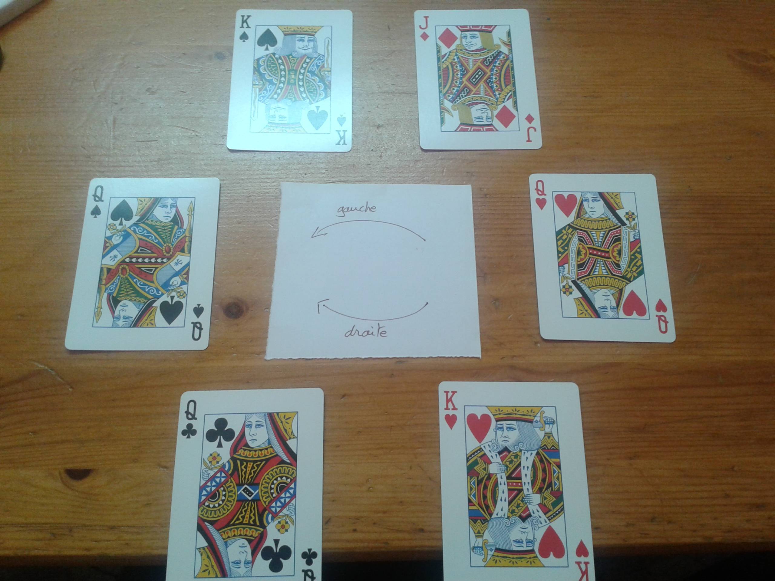 Pouvez-vous disposer la dame de cœur, le roi de pique, le valet de carreau, la dame de trèfle, le roi de cœur et la dame de pique (ce sont les seules cartes que l'on a, pas de cartes en double)afin de satisfaire les conditions suivantes :