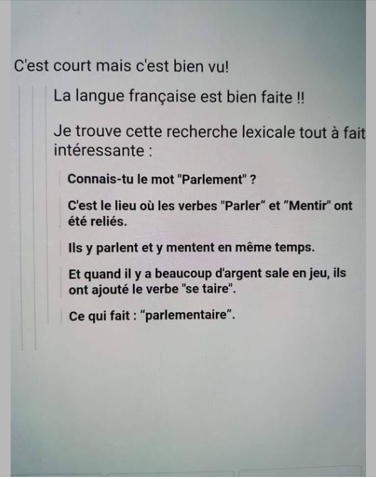 _ Douillou sink it's possible tou faire crack-crak wiziou zis ivening ? _ Never ! répond la prof, horrifiée. _ Splendid ! Disons never, never et demie ! répond l'élève, tout joyeux.