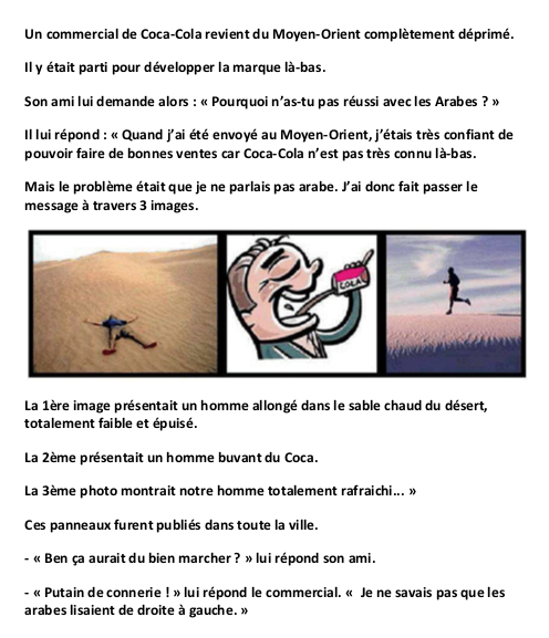 - Oui = non - Non = oui - Peut-être = non - Je suis désolée = tu vas le regretter - J’aurais besoin = je veux - C’est ta décision = tu te trompes - Fais ce que tu veux = tu vas payer pour ça plus tard - Je voudrais te parler = je veux me plaindre - D’accord, vas-y = je ne veux pas que tu le fasses - Je ne suis pas fâchée = bien sûr que je suis fâchée - Sois romantique, éteins les lumières = j’me trouve grosse, j’veux pas que tu me voies - Cette cuisine n’est pas très pratique = je veux une nouvelle maison - Je voudrais de nouveaux rideaux =…et un nouveau tapis et des meubles - Je t’aime = j’ai quelque chose à te demander qui va coûter cher - Je t’aime beaucoup = j’ai fait quelque chose que tu ne vas pas aimer. - Je suis prête dans une minute = enlève tes souliers, assieds-toi et regarde la télé… - Il faut que tu apprennes à communiquer = il faut que tu apprennes à être d’accord avec ce que je dis. LANGAGE DES HOMMES - Oui = Oui - Non = Non - J’ai faim = j’ai faim - Je suis fatigué = je suis fatigué - Veux-tu aller au cinéma ? = je voudrais baiser après - Veux-tu souper au resto ? = on pourra baiser après. - Veux-tu danser ? = après on pourra baiser. - T’as une belle robe = t’as un beau décolleté… Si on baisait ? - T’as l’air tendue, veux-tu un massage ? = On va baiser, ça te fera du bien ! - Qu’est-ce que t’as ? = j’imagine qu’on baisera pas ce soir. - C’est pas terrible à la télé… = on baise ? - Je t’aime = on baise ? - Moi aussi je t’aime = bon, t’es contente ? Est-ce qu’on peut baiser maintenant ! - Ça te va bien ta nouvelle coupe de cheveux = j’aimais mieux avant - Il faut qu’on se parle = j’ai plus envie de baiser avec toi