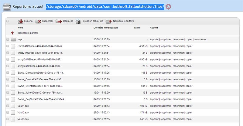 http://www.se7ensins.com/forums/threads/modding-fallout-shelter.1370013/ Je vais donner la méthode pour Android mais ça fonctionne aussi pour iOS. 1/ Téléchargez sur votre PC le logiciel suivant 2/ Fermez le jeu (toujours bien de le préciser). 3/ Il va falloir récupérer le fichier de sauvegarde. J'utilise Wifi File Transfer Pro pour Android afin de naviguer dans les dossiers de mon téléphone et récupérer directement le fichier sur mon PC. Les fichiers de sauvegarde se nomment Vault1.sav, Vault2.sav, Vault3.sav et se trouvent dans le dossier ![]() 4/ Après avoir récupérer la sauvegarde de votre abri, ouvrez le logiciel premièrement téléchargé (FSM.exe). 5/ Rien de plus simple avec ce logiciel, il décode et réenceode les fichiers de sauvegarde. Ouvrez donc un fichier .sav pour décrypter, on vous demandera l'emplacement de sauvegarde d'un fichier .json (la sauvegarde décodée). 6/ Ouvrez le fichier json avec un editeur de texte (Notepad++ FTW) 7/ Modifiez ce que vous voulez à vos risques et périls ! Mais voici comment ajouter les boites à sandwichs et Mr Handy dans l'étape suivante. 8/ Cherchez le mot "LunchBoxesByType". Voici la structure du code Le code type de la boite à sandwich est 0, Mr Handy est le 1. Il suffit alors de mettre autant de 0 et de 1 ;séparés par des virgules; entre les crochets de LunchBoxesByType que vous voulez de boites. Ce n'est pas fini, il faudra également changer la valeur de LunchBoxesCount avec le total de boites crées. Exemple pour 5 boites et 2 Mr Handy. 9/ Enregistrez vos modifications et réencodez le fichier json avec le logiciel FSM. Le logiciel va créer un nouveau fichier .sav 10/ Remplacez votre nouvelle sauvegarde avec celle modifiée. 11/ Relancez votre jeu...et enjoy ! Voila, il est possible de tout faire dans les fichiers de sauvegardes, notamment équiper tous vos persos avec des armes ultra cheaté, booster leurs STATS etc...Je vous conseille de vous reporter au 1er lien que je donne en haut pour les ID à modifier selon vos envies. Pour les flemmards, je donne quand meme derrière la liste des ID des armes. Bref, voila voila. Maintenant vous savez tout... Il est désormais possible de créer des abris loufoques en moins de deux avec cette technique...Ou cheater comme un gros porc parce-que "pas l'temps de niaiser t'as vu..." Inutile de dire que cette technique est testée et approuvée par moi meme, et sans virus ni "survey" à remplir. C'est du DIY mais simple et rapide. Bon jeu...bon cheat