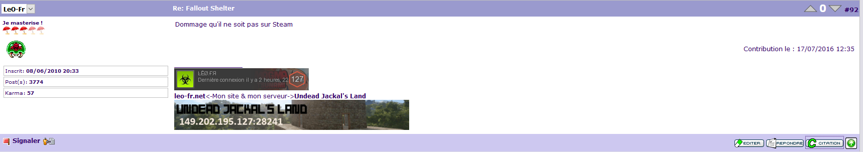 Il est pas sur steam mais gratuit (sauf les item in game comme sur android) et très simple a télécharger. Sur le site: http://www.falloutshelter.com/ Tu clique sur le ruban noir en haut sur télécharger pour PC. Instal.Ca te redirige sur bethesda.net, crée un compte si t'en a pas déjà un. 2 min montre en main. Plusieurs nouveaux truc depuis la dernière fois que j'y ai joué sur android: - Des quêtes avec une équipe de trois dweler. Tu y explore des bâtiments sous le même format que l'abri(usine, abri abandonné, relais red rocket) pour y chercher des nouveaux dweler, tuer des créatures et récupérer du matos. Tes gars en exploration peuvent déclencher se genre d’événement. Mais ils seront tout seul si tu décide d'y aller. Tu peut aussi passer à coter. -Tu peu fabriquer des armes dans l'abri via deux salles spéciales une pour armure l'autre pour armes. Upgrade pour avoir accès aux armes rares et trouve des plan et pièces pour fabriquer dans les terres désoler. -Truc de coiffure qui te permet de customiser les personnages - Tu peut maintenant gagner mister handy et animaux de compagnie en récompense d'objectifs ou de quêtes. Bon ça reste un jeu de gestion tu t'y connecte fois par jour quoi. ![]()