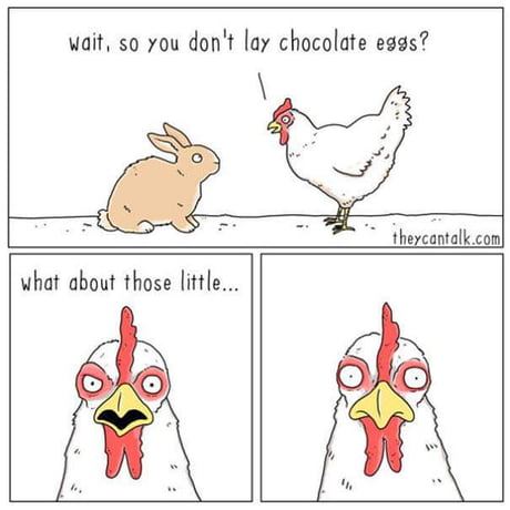 ![]() "attends! Donc tu ne ponds pas d'oeufs au chocolat?!" "mais qu'en est-il de ces petites..."