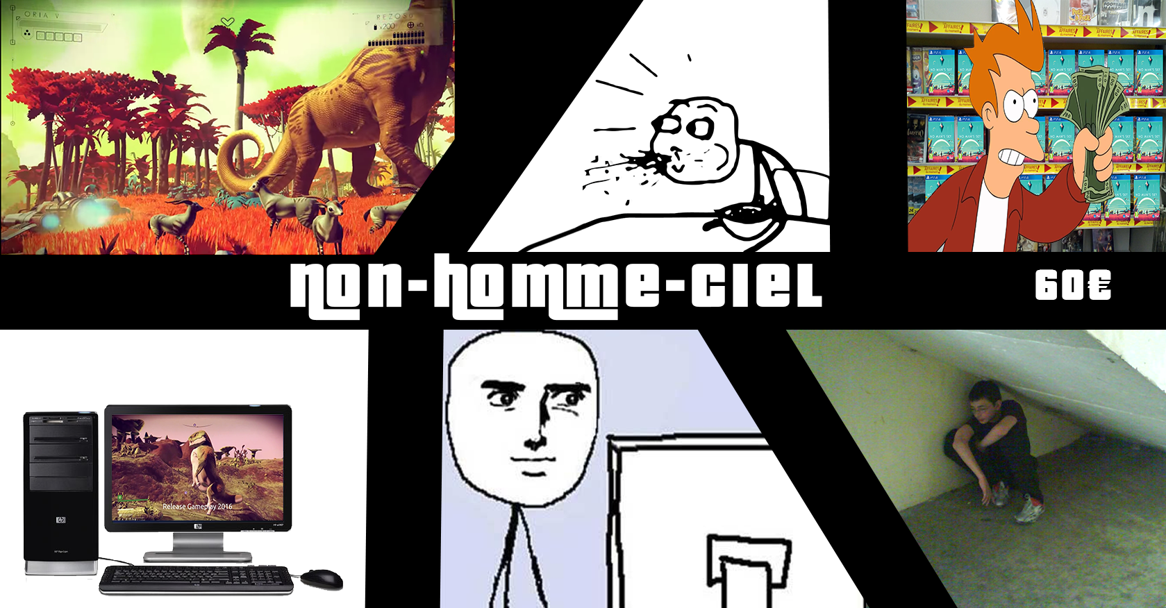 Je vous fait part d'un montage fait par ennuie qui représente mon analyse de No Man sky qui est un jeu très populaire ces derniers temps et est également une grosse arnaque. Bien évidemment tous les développeurs de jeux vidéos ( pas vraiment eux, mais le marketing derrière) utilisent des machines de guerres pour montrer du gameplay en ULTRA 4K BOOM BOOM effet et tout avec des séquences scénarisé, je marche lentement, je regarde autour, les fameux trailers de jeux vidéos quoi... Ce genre de rendu est impossible à obtenir pour le commun des mortels et au final le jeu a sa sortie est downgradé (qualité graphique diminué) et pire extrêmement mal optimisé, bugé, instable (crash) etc... bref les jeux en 2016 quoi.