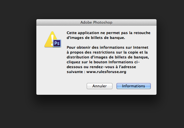 @-does- Refait le test avec un vrai billet de 50 €, même de mauvaise de qualité comme celui-ci et tu verras un message d'avertissement sous CS6 normalement :