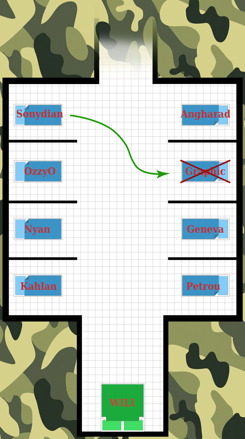 Nuit 2 - L'entrainement Aujourd'hui fut une journée éreintante pour les jeunes recrues que vous êtes. On vous a donné une seule épreuve, mais quelle épreuve! Ce fut la chose la plus dur que vous ayez faites de toute votre vie, d'une souffrance inouïe, vous vous demandiez qu'est-ce que vous avez fait au bon dieu pour mériter ça! D'ailleurs l'un d'entre vous a craqué, il n'a pas pu allez jusqu'aux bout. Et craignant les instructeurs, l'équipe a décidé qu'il fallait s'en débarrassez elle-même de la brebis galeuse, c'est ainsi que vous le mettiez à mort avec les outils que vous aviez à la main. Pauvre Geo... A son propos, il faut savoir qu'il venait d'un milieu plutôt modeste, il était dans l'armée parce qu'il avait un tonton qui était para, alors il a voulu suivre ses pas, malheureusement il n'a pas réussi, nous aurons tous une pensée pour lui, pour ses efforts et les sacrifices qu'il a enduré pour arriver à ce niveau, geo tu était un grand, un bon comme on en vois peu, avec un cœur gros comme ça, d'ailleurs tout le monde t’appelais le cupidon. Tu restera à jamais dans nos mémoires! Nan je déconne, on s'en bat les steacks, le MJ à trop traîné il faut jouer!!! Bref, une fois la journée terminée, vous regagnez votre chambre avec grande peine, vous êtes complètement lessivé, vous n'en pouvez plus, alors d'un commun accord vous décidez juste avant de dormir que vous n'éplucheriez plus aucune patate de toute votre vie. Résumé Geo-graphic a été mis a mort. C'était cupidon! Recrue restante kahlan nyan-nyan petrou Geneva Wiliwilliam_ Angharad SonyDian OzzyO Rôles restants 2 loups 1 enfant sauvage 1 voyante bavarde 1 chasseur 1 sorcière 1 ancien 1 renard Champs du déshonneur Geo-graphic Votre tour La nuit arrive avec son lot de MP.