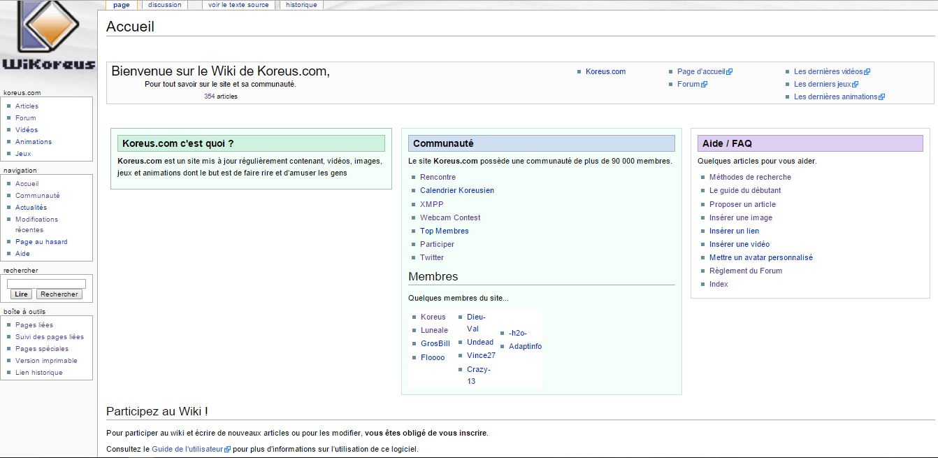 Partagez ici vos idées, vos retours - - - - - - - Hello à tous, Alors tout simplement, je me/vous propose de mettre à jour le wiki de Koreus, alias "Wikoreus" (-> ici pour le wiki.koreus.com) Objectif : Dépoussiérer un peu le truc, mettre à jour les infos, ajouter des explications/astuces (genre "comment insérer une image sur Koreus.com"), mettre un coup de neuf, refaire la tapisserie, etc Pour rappel, Koreus avait créé ce Wiki en 2007 >> Lien du topic de l'époque si besoin << Il me semble que ça pourrait être utile : - Parce que le lien vers le wiki figure toujours depuis la page d’accueil du site, mais le contenu du wiki est bien obsolète - Et parce qu'à mon sens il y aurait pas mal de trucs à mettre (à discuter avec vous sur le contenu à faire figurer) Quelques questions pour lancer le truc : - Est-ce qu'en tant que membre lambda (pas modo quoi), je peux tout simplement faire ça ? - Si oui, question bête : Comment se connecter sur le wiki ? En allant sur "connexion" en haut à droite, j'arrive pas à me connecter avec mon pseudo/mot passe Koreus ni avec pseudo/mot passe wikipédia :-? Y a une démarche particulière à faire ? - Comment vous pensez qu'il faille s'organiser pour ça ? J'imagine qu'il faut que les choses soient un minimum contrôlées/validées non ? - Avez-vous des suggestions de contenu à mettre ou ne pas mettre ? N'hésitez pas à y jeter un coup d'oeil, vous y inscrire et y contribuer ! Note : Pour vous inscrire, vous devez vous créer sur ce Wiki Koreus un nouveau pseudo et mot de passe (vous ne pouvez pas utiliser votre pseudo & mot de passe de Koreus ou Wikipedia) - - - - Lien du ticket résolu pour re-permettre l'inscription à tous sur le Wiki Koreus, et ainsi le modifier : [Résolu] Connexion impossible au Wiki Koreus