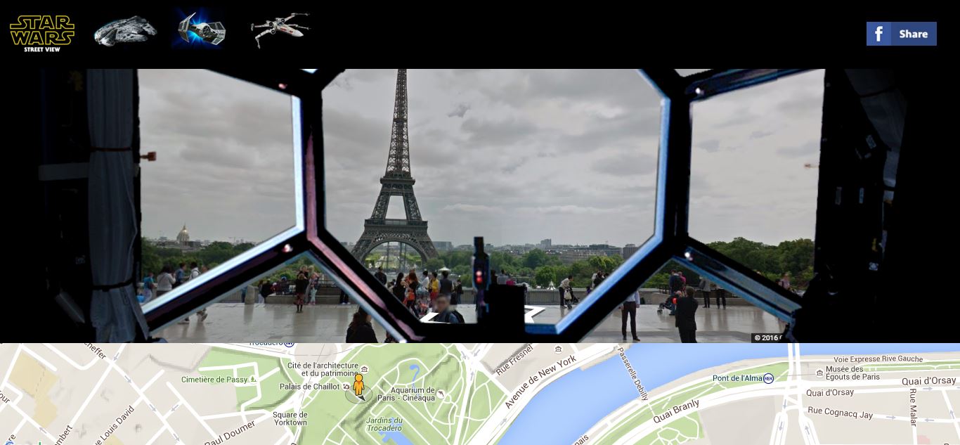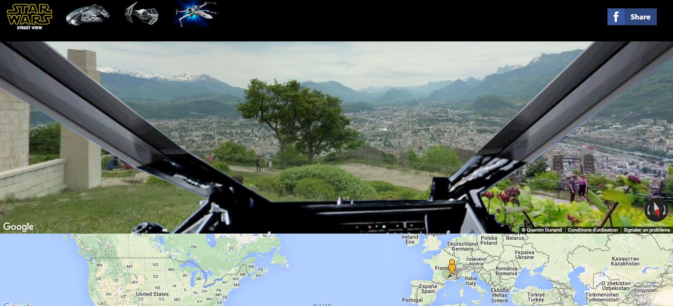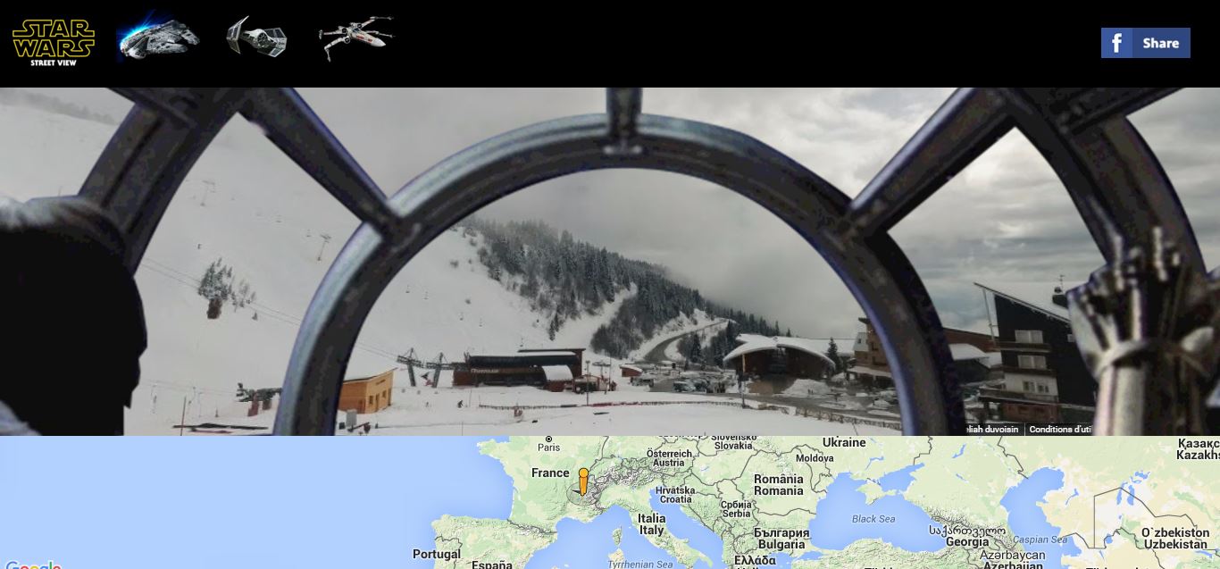 Depuis la sortie du Star Wars 7, un site propose de naviguer dans Google Street View à bord du Faucon Millenium de Han Solo, du Tie Fighter de Dark Vador, à bord ou du X-wing de Luke Skywalker.