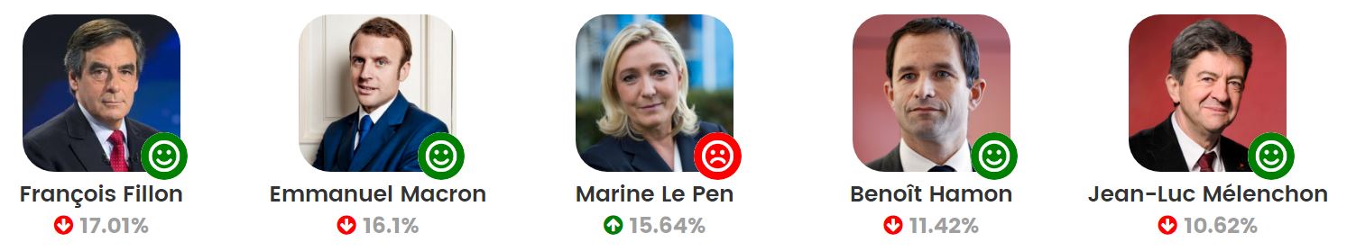 - Ce ne sont pas des "sondages commandés" il me semble, mais l'analyse du ratio nbr d'article avec en titre "Macron" / nbr (? de je sais pas quoi) sur les réseaux sociaux - C'est tout basé sur l'analyse unique de Dentsu Consulting (Véronique Reille Soult) ? - Quand est-il de ce ratio titre d'article / réseaux sociaux pour les autres candidats ? (car dire "cest bcp", pour moi ca veut rien dire en soi) - Uniquement les médias de gauche ont relayés cette info on dirait .. Preuve que Macron n'est donc vraiment pas de gauche ?Mais interessant et je suppose que c'est vrai .. mais j'avais quand meme ces questions ![]() EDIT : Ya un outil marrant qui compare graphiquement la présence des candidats sur 24 medias : candidats.media ![]() (Bleu = Fillon, Vert = Macron, Rose = Hamon, Violet = Le Pen, Orange = Mélenchon) ![]() "Ces classements dynamiques selon les dernières 24 heures, les 7 jours précédents et le mois précédent révèlent le pourcentage de présence médiatique des candidats à l'lélection présidentielle. Pour chacun des candidats, un indicateur (*up* ou *down*) illustre la tendance à la hausse ou à la baisse de sa médiatisation. Un second indicateur, sous la forme d'un smiley, révèle la positivité ou la négativité de la médiatisation globale du candidat selon la période choisie." Ou encore : coursepresidentielle2017.com