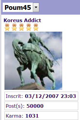 félicitations @Poum45 , tu mérites ta petite page sur le wikikoreus ^^ merci pour la dédicace ![]() pour le petit souvenir : ![]()