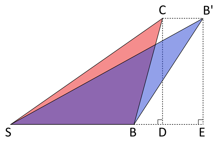 Il me semble que le truc est de remarquer que le segment SCB' n'est pas une droite : Tu vois un petit angle au niveau de C. Donc le triangle SBB' a certe un morceau d'air en plus (BB'C) par rapport au triangle SBC, mais aussi une portion d'air en moins (la portion SB'C) Donc certainement que via leur démonstration OK, surface (SBB') = surface (SBC)