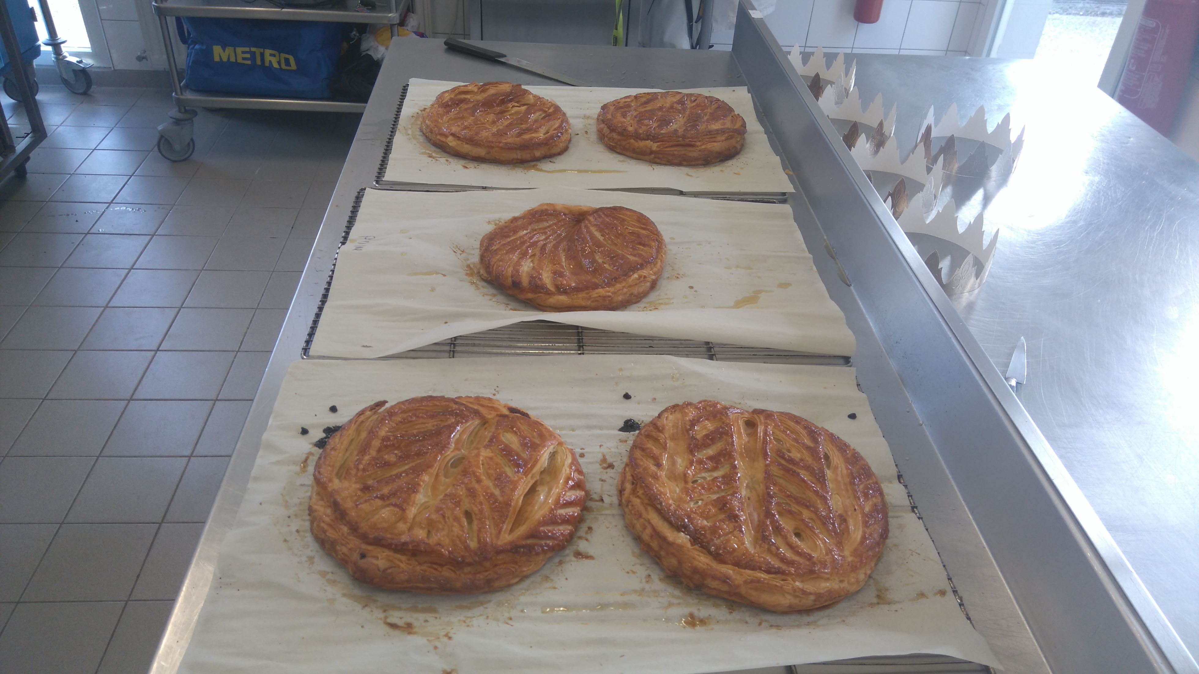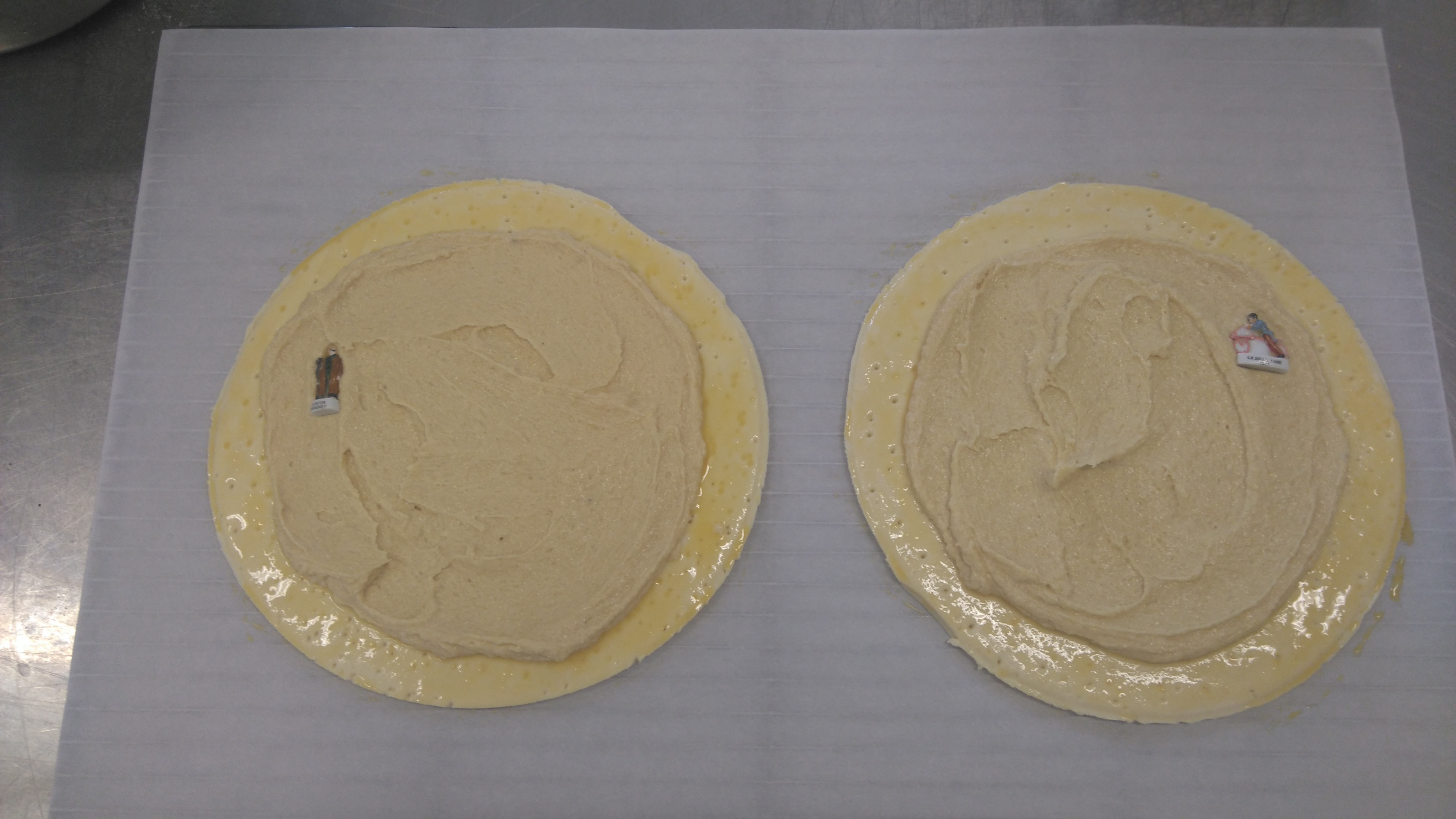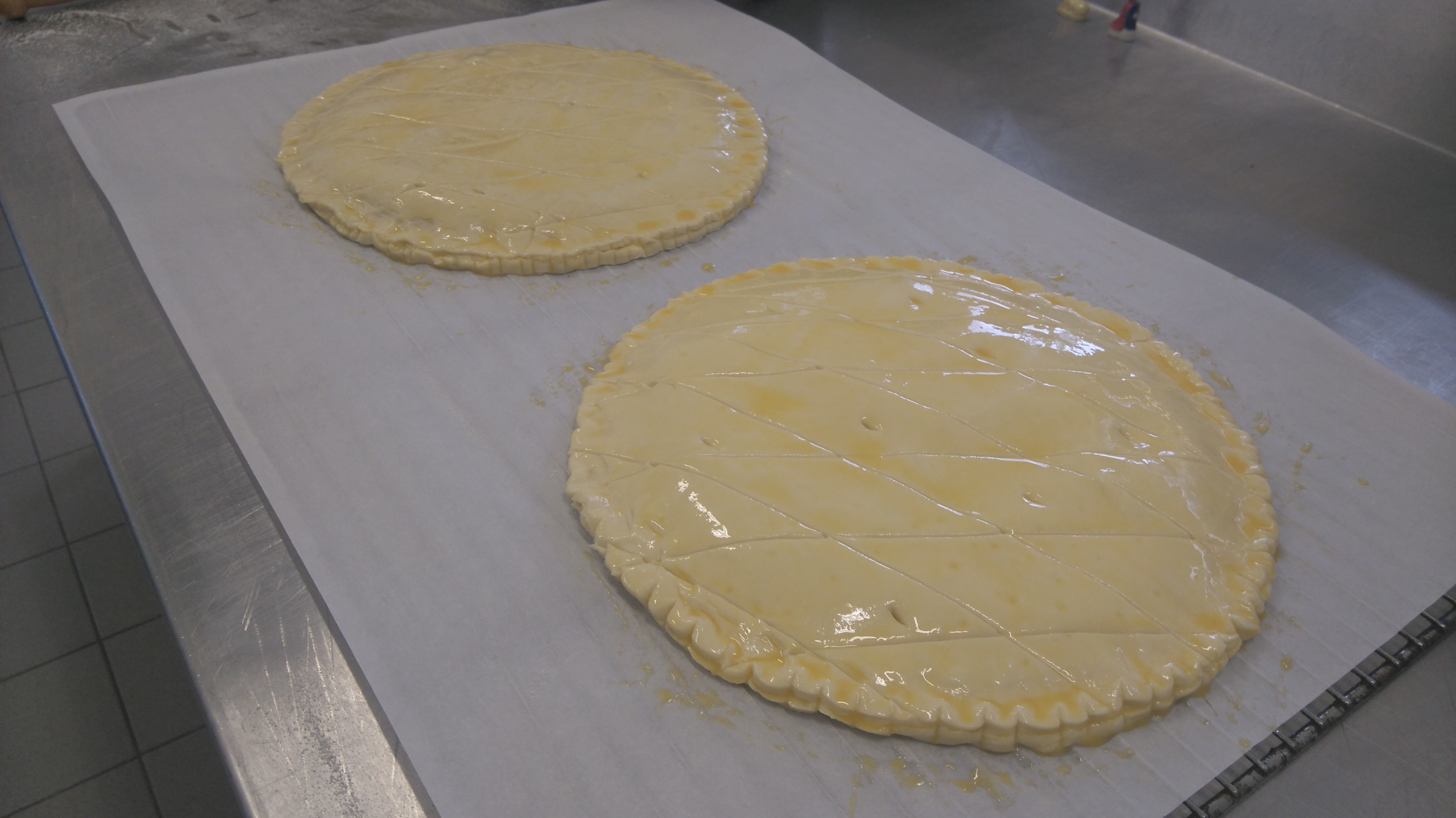 Mis en place des éléments : ![]() Dorure sur les bords, garniture et fèves : ![]() Soudure sur les bords, dorure et décor au couteau : ![]() ![]() Pour finir, encore un petit séjour au froid pour reposer tout ça : ![]() Dernier épisode,début d'après midi ! ![]()