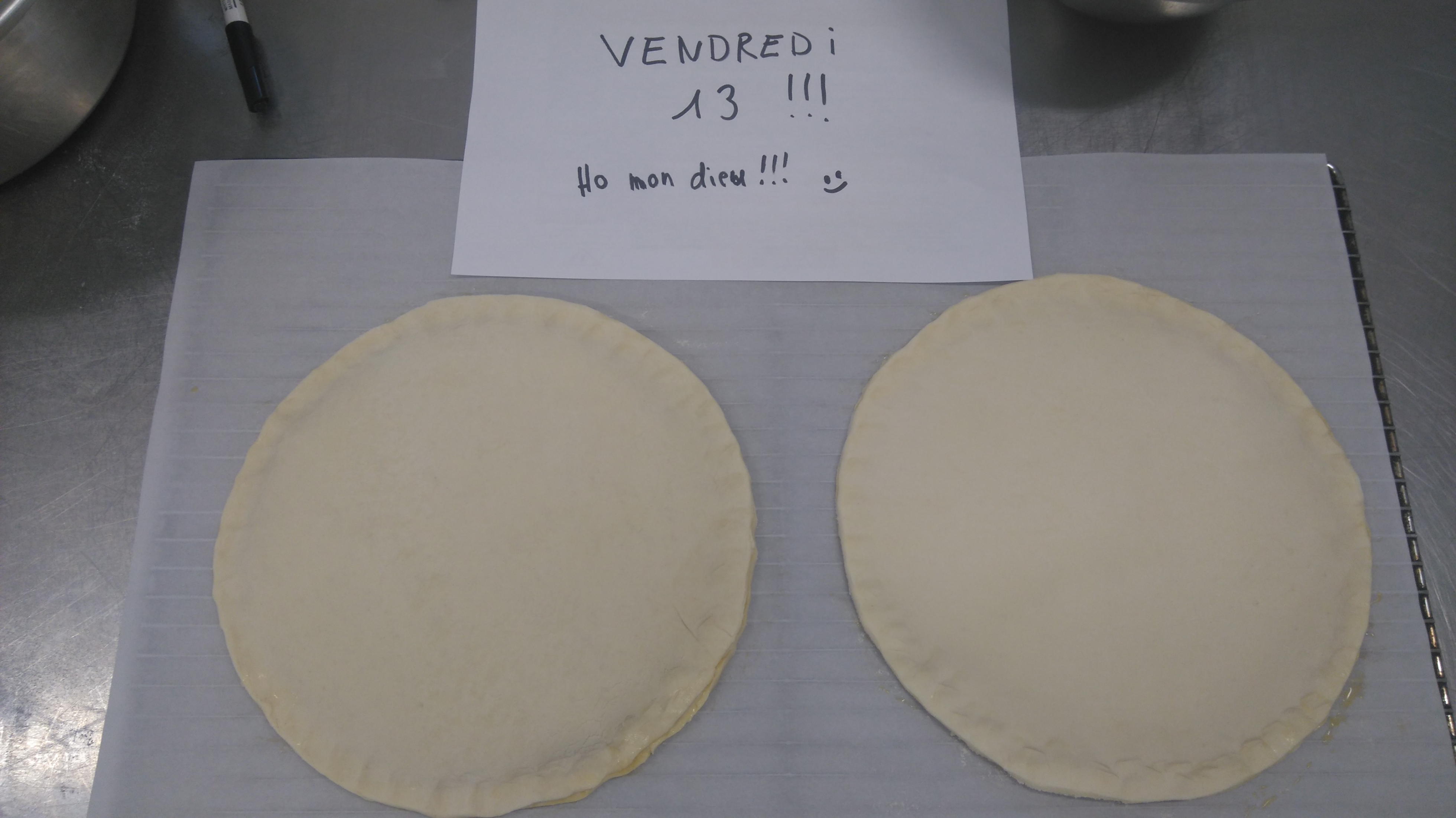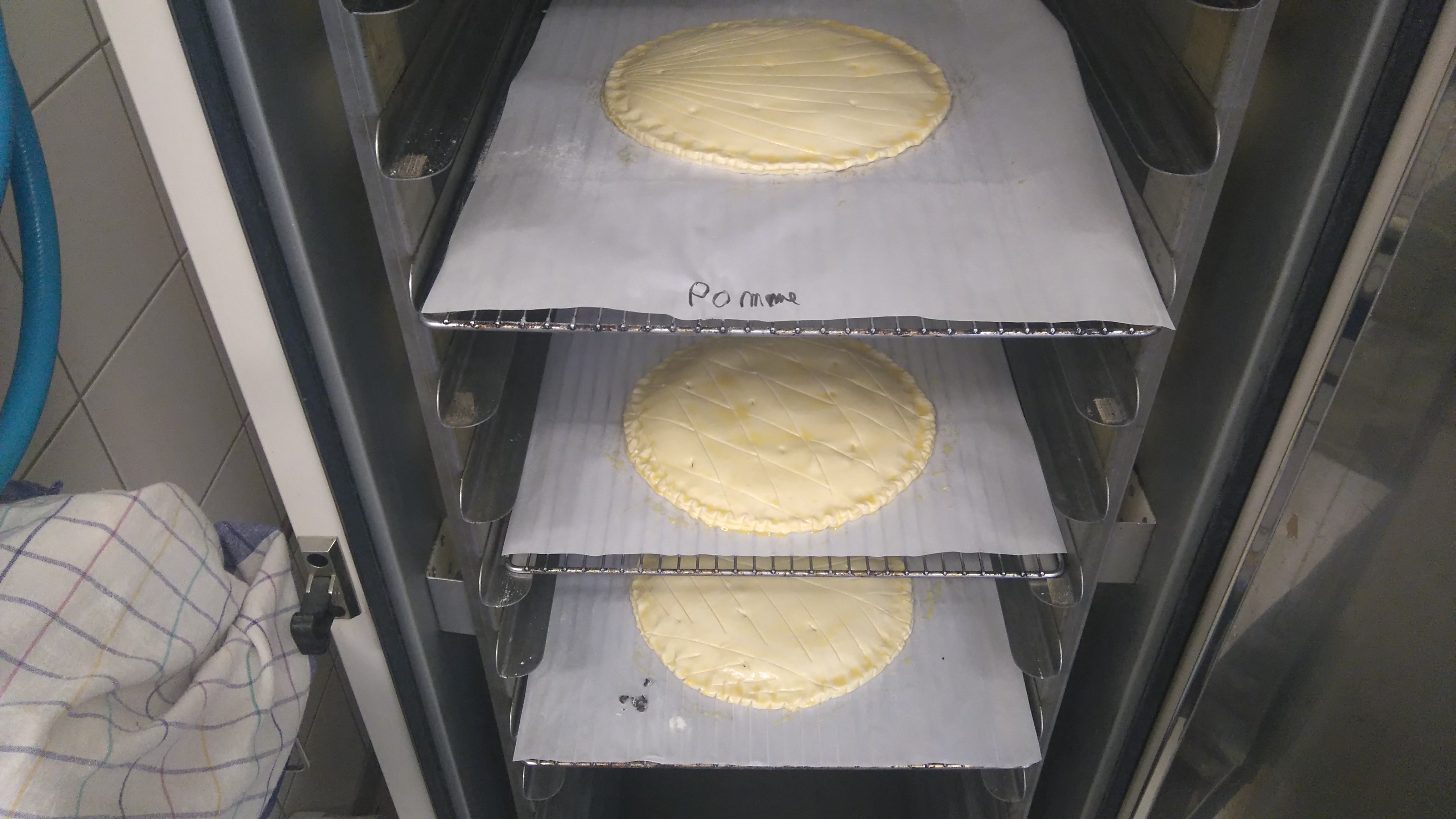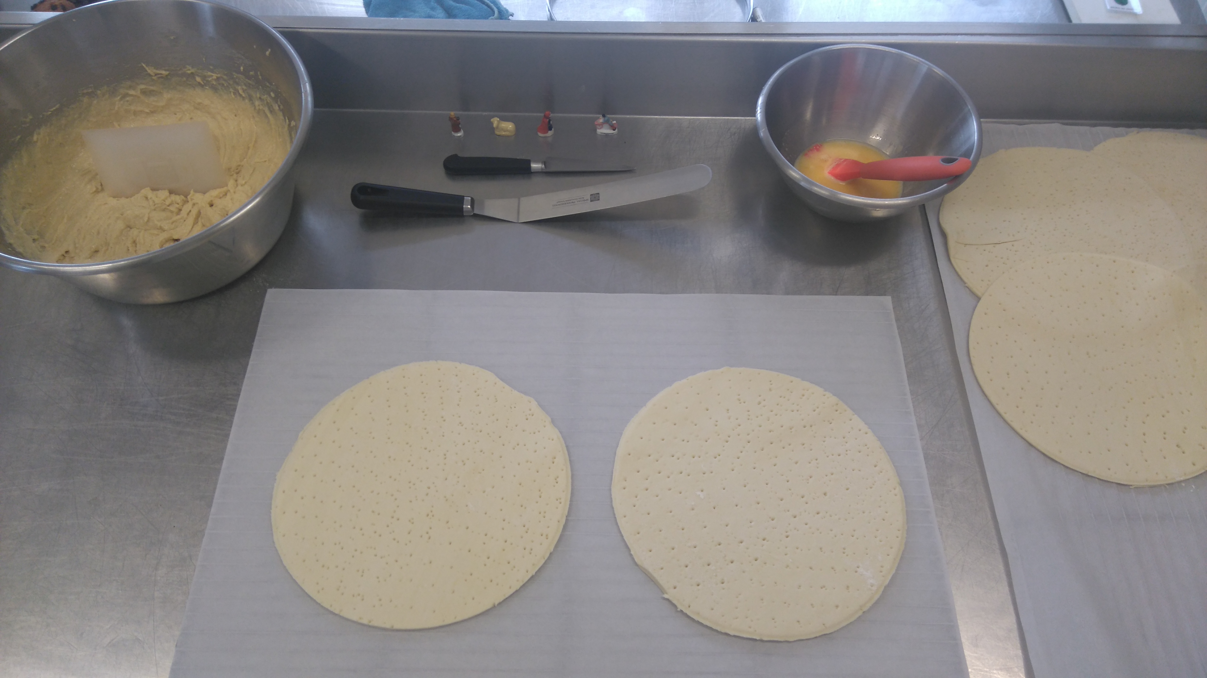 Mis en place des éléments : ![]() Dorure sur les bords, garniture et fèves : ![]() Soudure sur les bords, dorure et décor au couteau : ![]() ![]() Pour finir, encore un petit séjour au froid pour reposer tout ça : ![]() Dernier épisode,début d'après midi ! ![]()