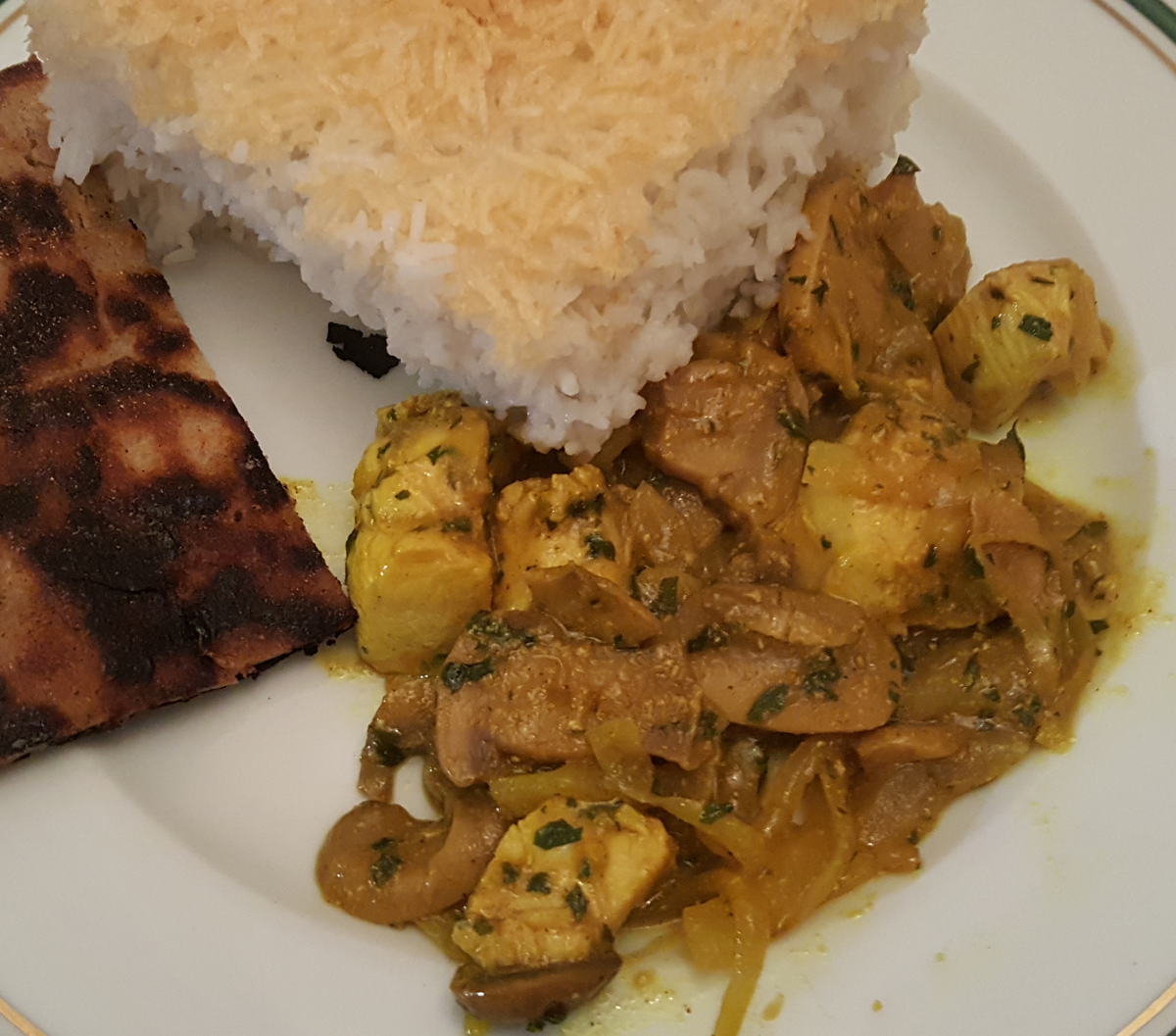 Elle expérimente, mais toujours en pâtisserie. Là, elle a compris qu'il ne fallait pas mettre 10 feuilles de gélatine pour un nappage ![]() Sinon, PPF s'il fallait : Poulet au curry, son riz basmati et ses Cheese Naan (pain indien au fromage) ![]() ![]()