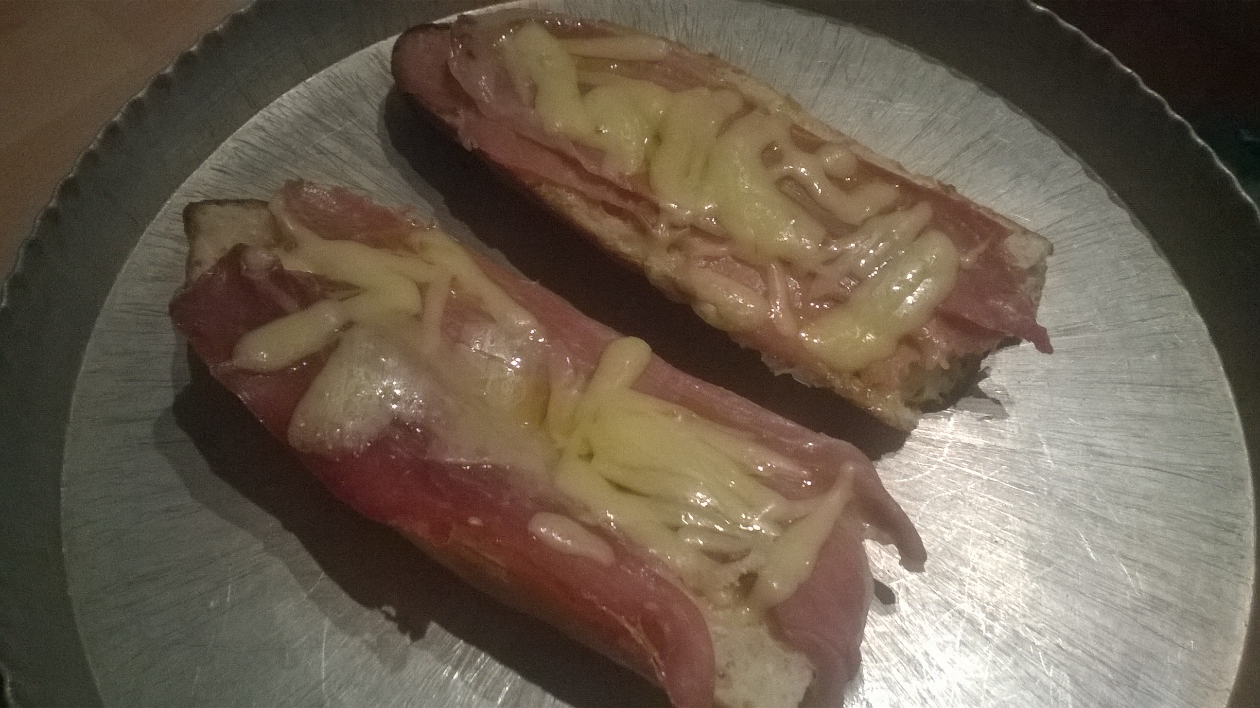 | J'aime glander ici    Inscrit: 23/04/2013 21:46 Post(s): 5465 Karma: 403 | Bon ce soir tout seul chez moi, j'avais du vieux pain (tout mou pas sec) et du jambon d'ouvert. Alors hop, je me suis dit que j'allais tenté de faire un croque monsieur comme ça sans regardé de recette^^. Un peu de beurre une tranche de Jambon (j'aurais préféré du Blanc) et du comté, un petit moment au four et voilà!  Mon portable à vraiment une qualité de merde^^