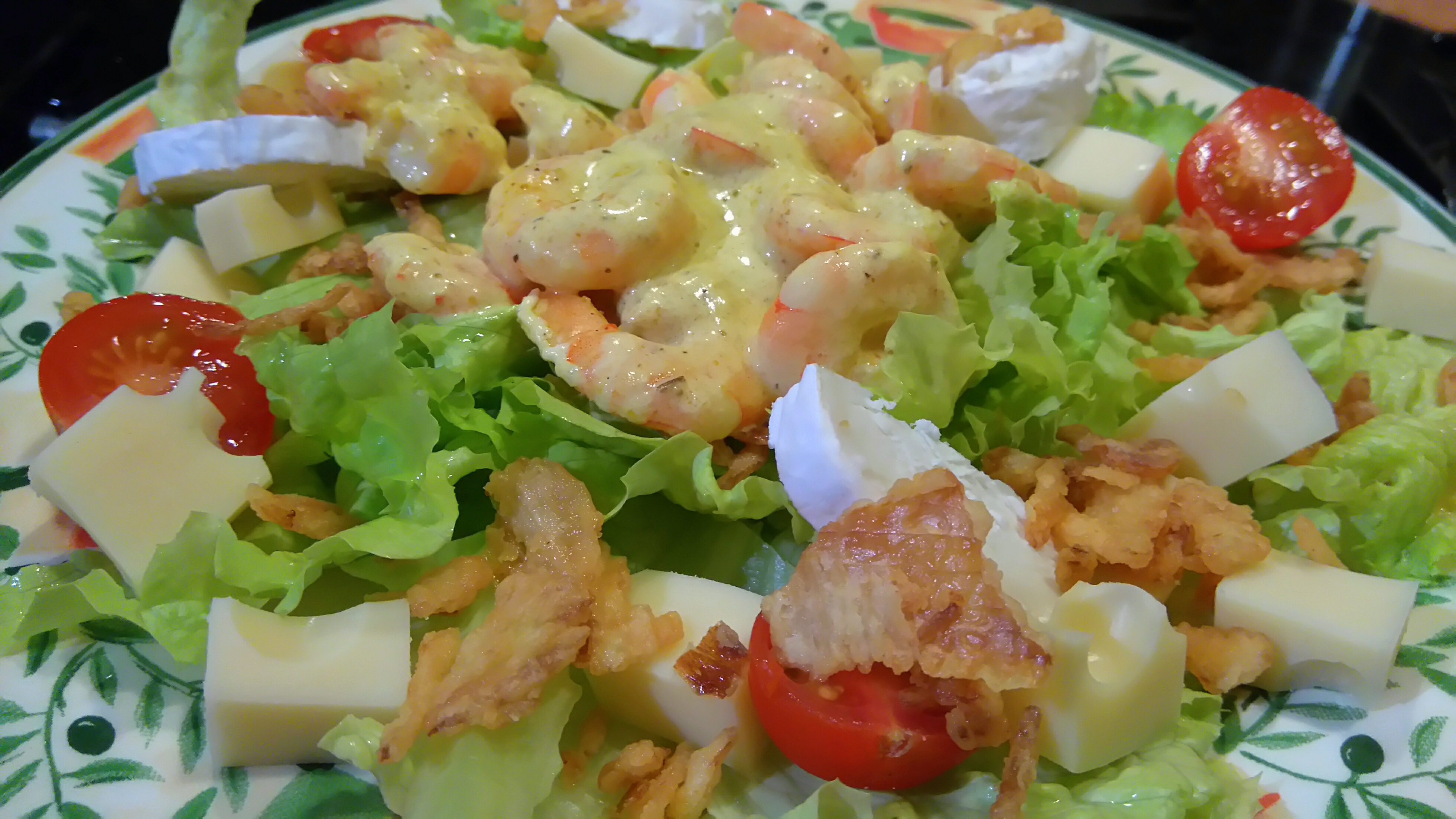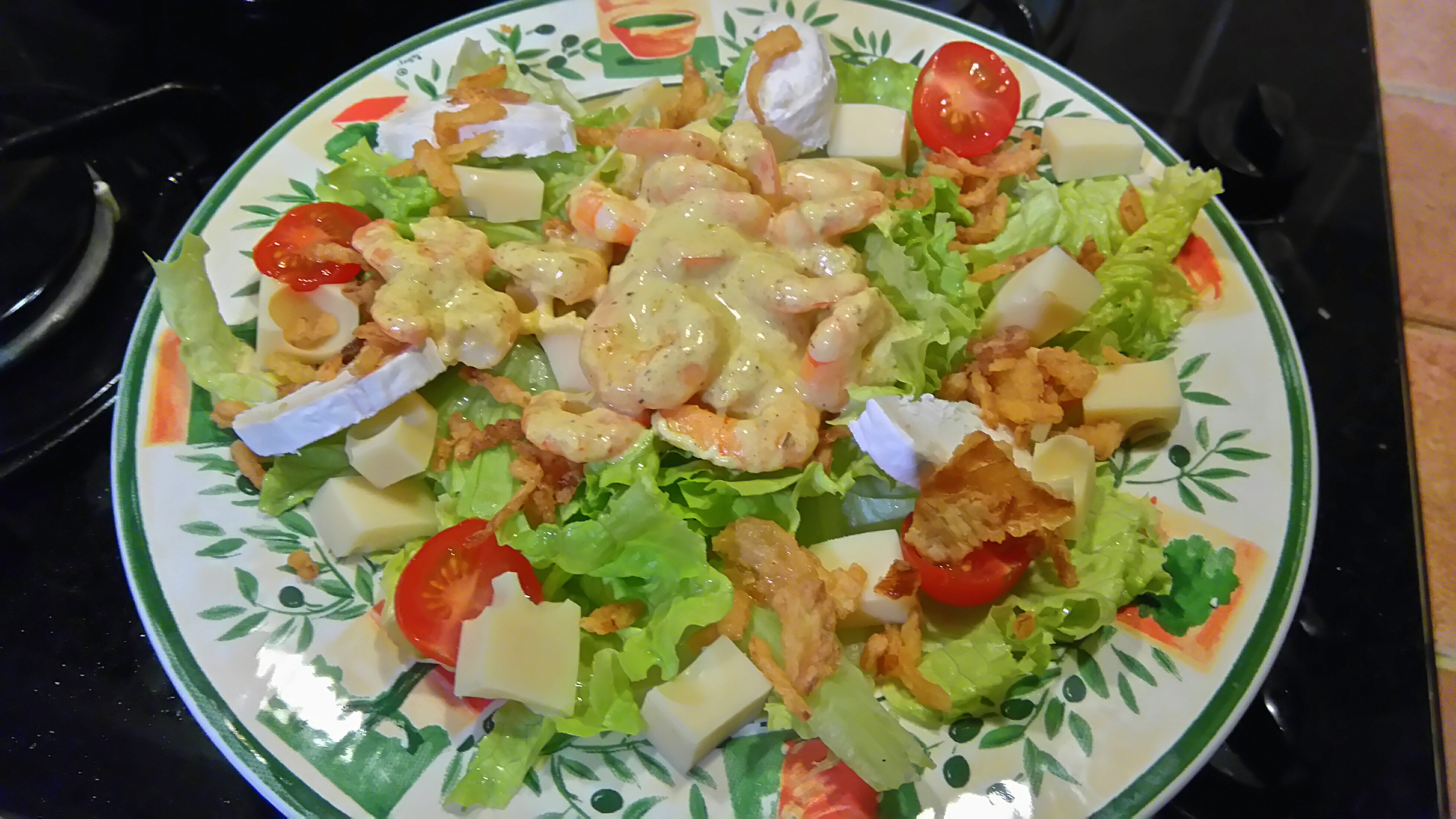 | Serial Locker    Inscrit: 22/01/2007 23:42 Post(s): 19106 Karma: 5751 | Salade du jardin, dès de gruyère, tomates cerises, chèvre, oignons fris, crevettes sauce curry :    Après une sortie VTT, une petite salade et le tigre est en toi !