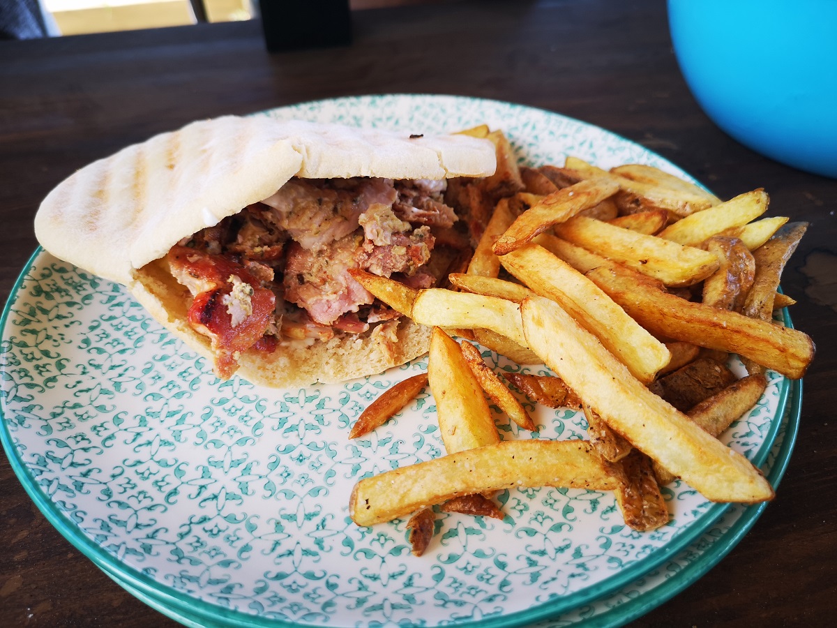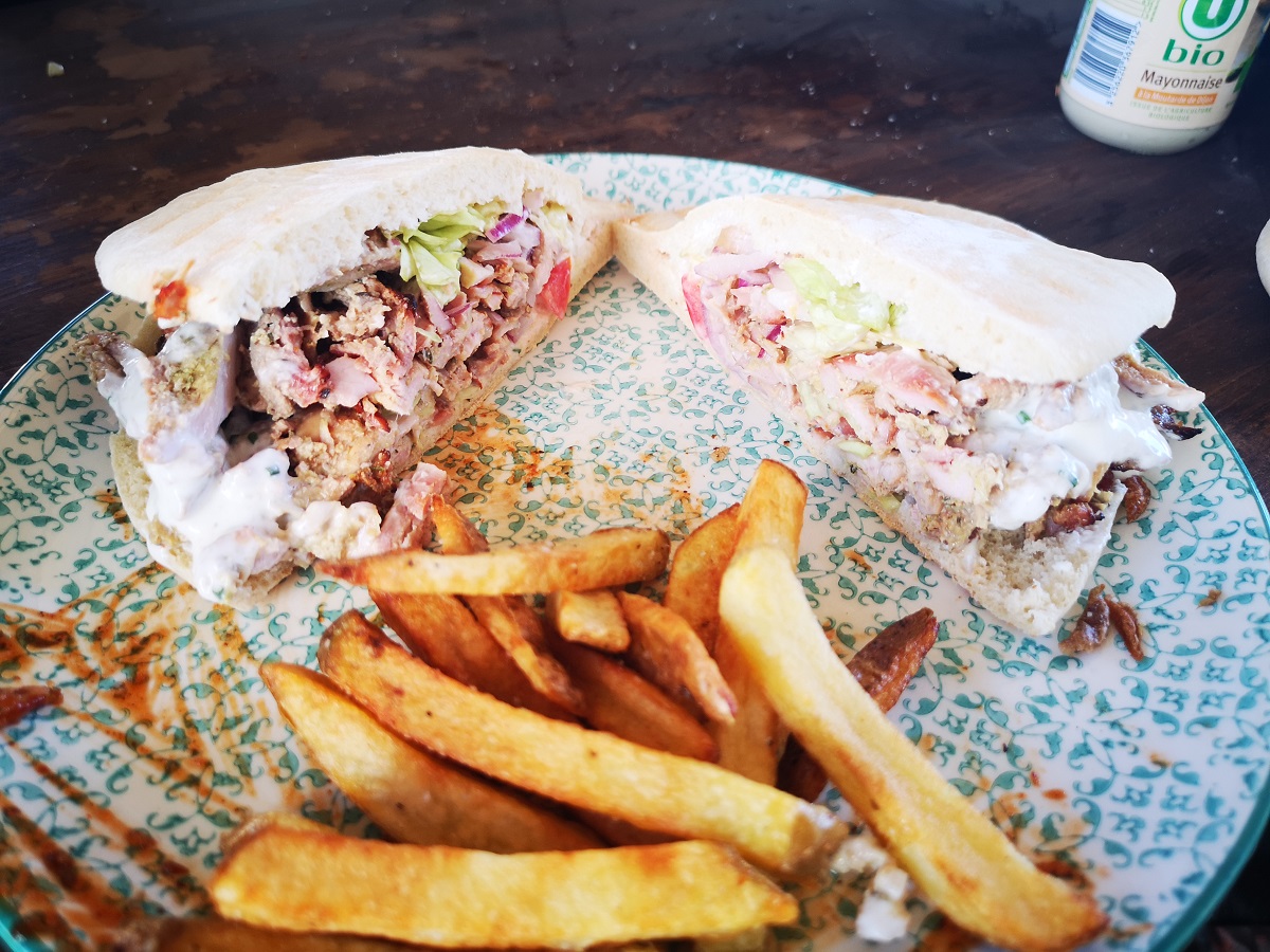 Kebabs 100% maison, pain, viande, sauce, frites :