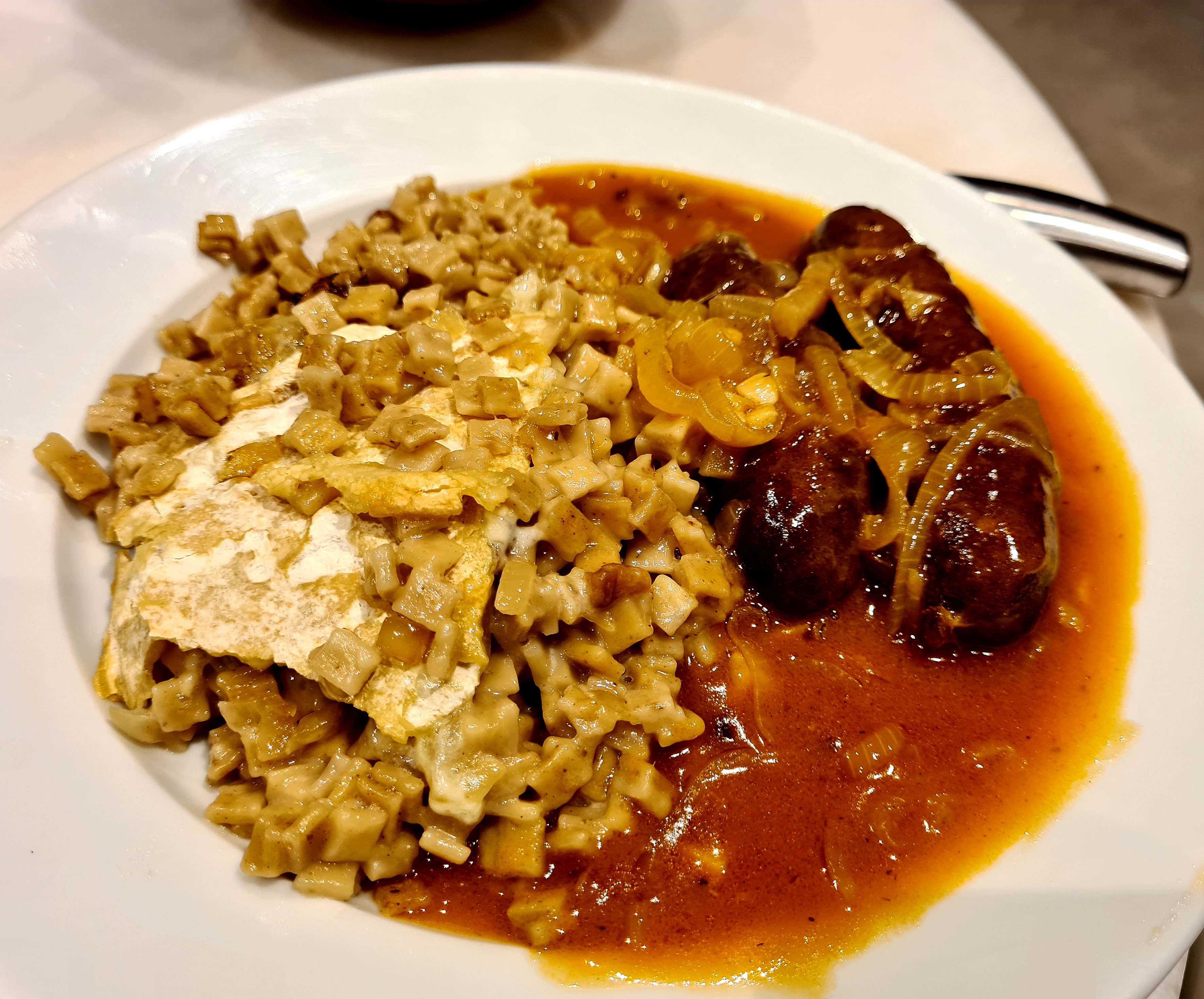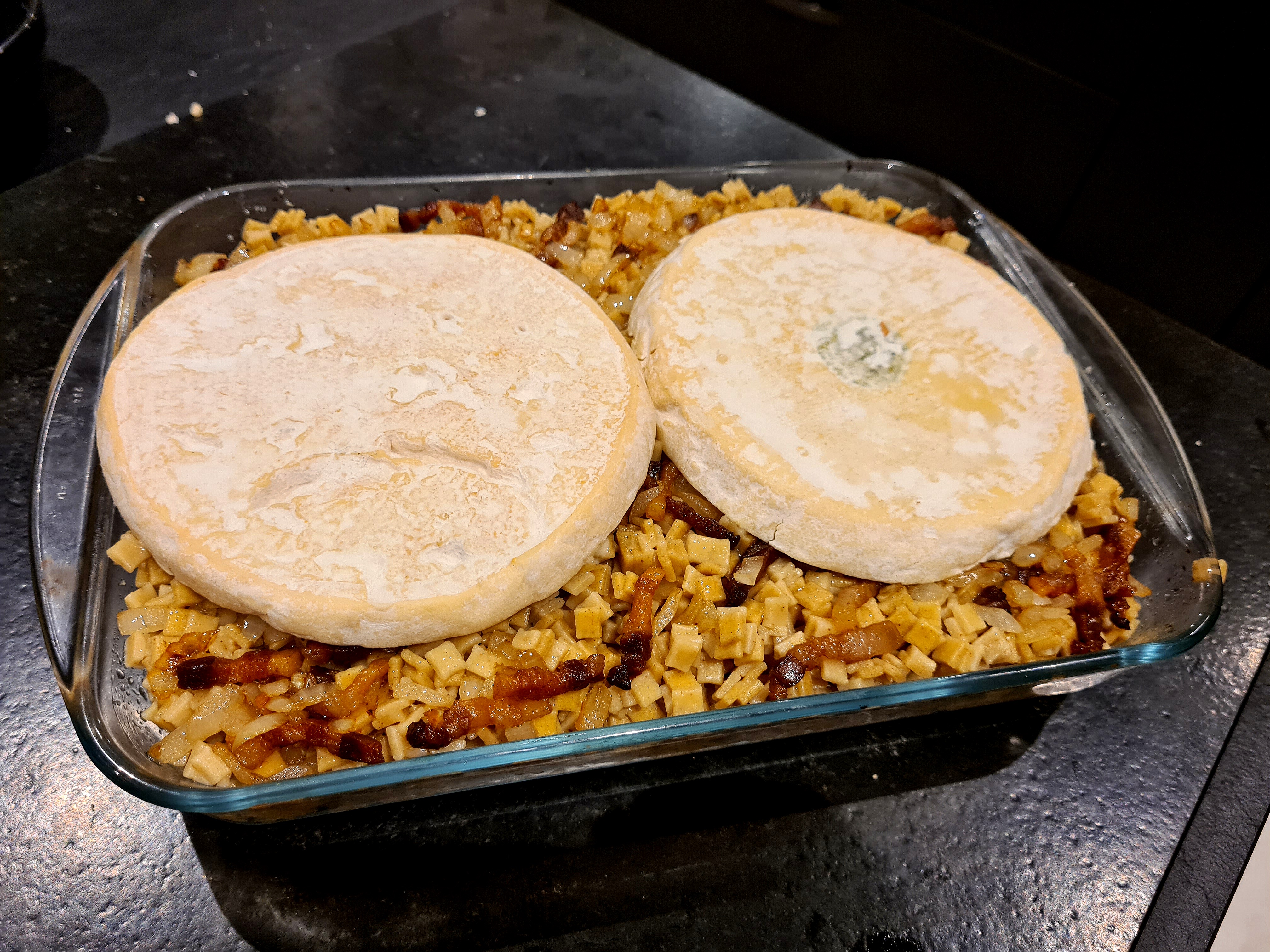Diots au vin blanc avec une sauce à base de fond de veau maison + croziflette en accompagnement. Reblochon fermier et lardons maison (voir plus bas)