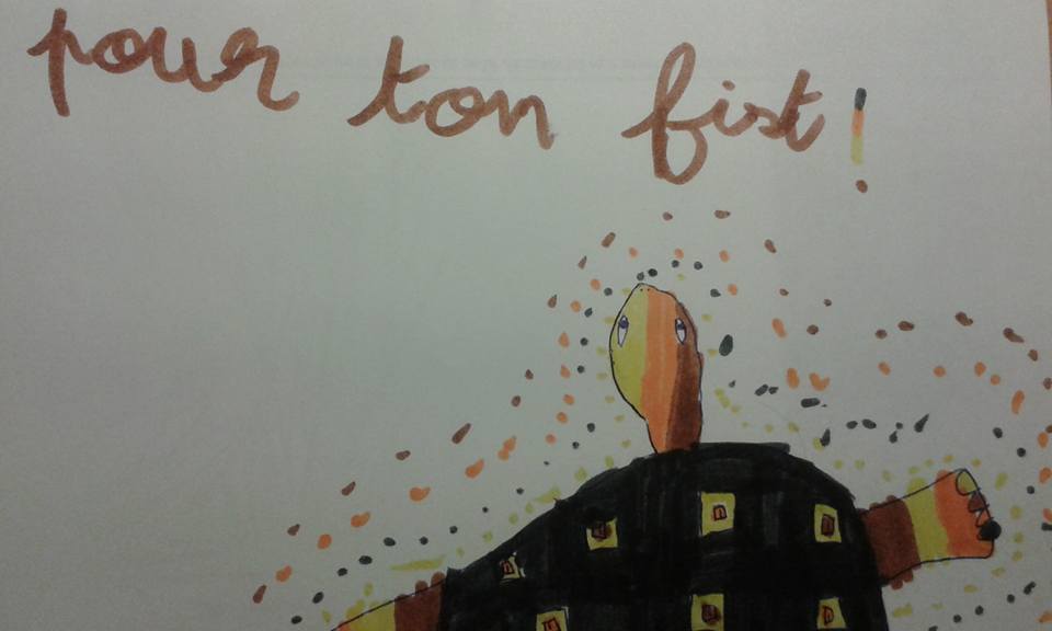 ![]() Explication : L'autre jour, je tombe sur une pile de dessins des élèves de CE1 de ma mère. Parmi ces dessins (tous de tortue), j'en ai trouvé un très réussi. J'ai fait ce retour à ma mère qui a ensuite relayé ce retour à son élève quand elle lui a rendu son dessin (les élèves savent que je dessine). Et voilà que l'élève lui donne un nouveau dessin en fin de journée, à mon intention. C'est mignon, mais il y a juste ce mot, cette faute qui ruine tout ![]()
