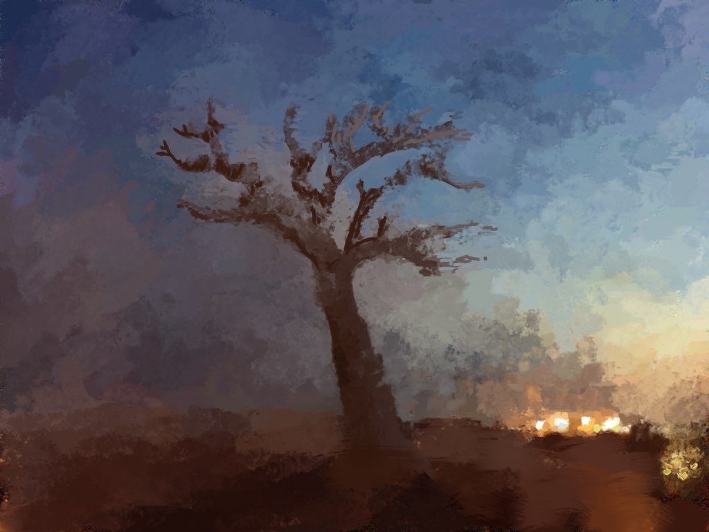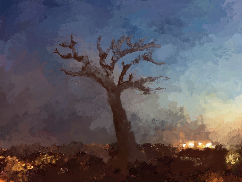 J'aime bien le style, ça fait très craie grasse. Personnellement je ferais des branches plus longues et j'éclairerais un peu plus l'arbre à droite. Ca me rappelle un dessin que j'avais justement fait à la craie grasse et mon arbre se transformait en une main (genre main qui sort d'outre tombe). Moi je comprends ta poètitude !
