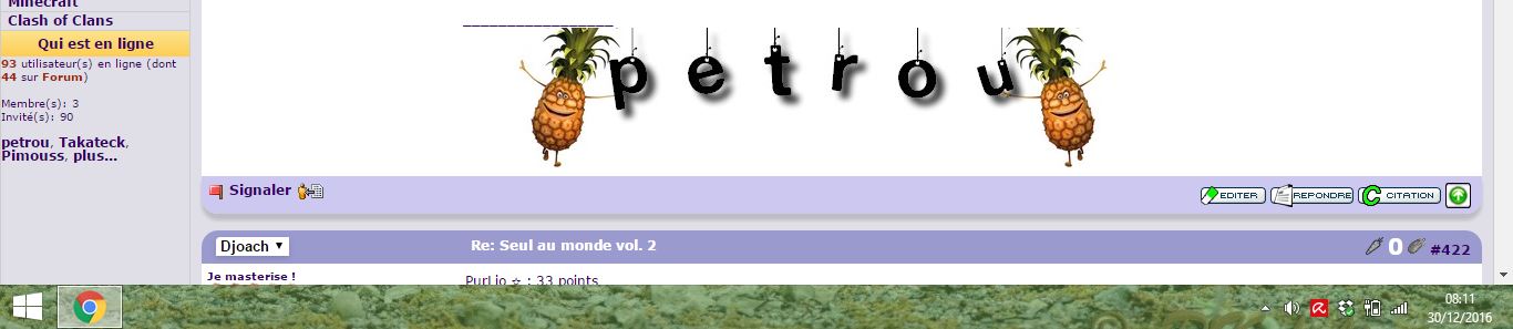 Alors... Classement de Décembre 1er : PurLio ☆☆ (221 points) 2e : Insert ☆☆ (51 points) 3e : Poum45 ☆☆☆☆☆ (38 points) Infame_ZOD : 24 points Carraidas ☆☆ : 20 points Djoach ☆ : 17 points petrou : 15 points carpet_bombing : 12 points kahlan : 10 points Chapeau à @PurLio et sa belle ascension ! Il fait tomber un nouveau record dans le Seul au Monde, à savoir 211 points ! Quelqu'un atteindra-t-il la barre mythique et indépassable des 465 points... Peut-être l'année prochaine ?... ...ssuuuuuuuuuuuuuUUUUUPERBE TRANSITION !!! ------------------------------------------------------------------------------------------------------------------------------------------------------------------------------------------ ------------------------------------------------------------------------------------------------------------------------------------------------------------------------------------------ Ainsi s'achève une année de Seul au Monde !! Merci à tous d'avoir été présents, d'avoir maintenu actif ce jeu ; si vous le voulez bien, on est reparti pour un an ! Pour cette nouvelle édition, les scores sont intégralement remis à zéro (oui, oui, même vos étoiles durement gagnées !), c'est le moment de montrer que vous êtes un vrai solitaire. Félicitations aux gagnants @Djoach @PurLio @Carraidas, (oui, toi aussi @Insert, du calme...) et @Poum45, le grand vainqueur de cette année ! ![]() Théorie des ensembles de Zemelo-Fraenkel : Axiome d’extensionnalité, de la réunion, de l'ensemble des parties, de l'infini, de remplacement, du choix-T'es aussi seul au monde que moi, mec ! Et encore merci à tous les autres: @Alpablaise @Blackjackdavey @Djizeus @-does- @fredoyatta @Galora @kahlan @Infame_ZOD @LeO-Fr @maieuh @Maitre-Capello @-Ninja- @Noemus @Nwc-Vincent2 @Nyark_Nyark @Olfiix @OzzyO @petrou @Pimouss @Pouip @Quokka @Remiweb @Skwatek @Spammer @Tchairo @Titlexe @TrChSl @WTHellias marre des notifs, envoie STOP par mp au 46 73 78 C'EST REPARTI POUR UN AN! Petit récap' : Classement de Janvier 1er : Poum45 ☆ (95 points) 2e : Blackjackdavey (59 points) 3e : petrou (35 points) Insert : 30 points Galora : 22 points Quokka : 13 points OzzyO : 11 points Kahlan: 10 points -Ninja- : 7 points Dieu-Val: 7 points Skwatek 5 Points Noems: 5 points Modjo : 4 point DonMascarpone : 3 points TrChSl : 3 points Fredoyatta : 1 point LeO-Fr : 1 Point _______________________________________________________________ _______________________________________________________________ Classement de Février 1er : Poum45 ☆☆ (118 points) 2e : -does- (92 points) 3e : Insert (88 points) petrou : 60 points PurLio : 41 points Siddh : 22 points Nyark_Nyark : 21 points -Ninja- : 15 points Djizeus : 13 points Pimouss : 10 points Klymahnn : 9 points Blackjackdavey: 8 points kahlan : 5 points Spammer21 : 5 points Noems: 4 points Quokka : 4 points Modjo : 4 points _______________________________________________________________ _______________________________________________________________ Classement de Mars 1er : Poum45 ☆☆☆ (125 points) 2e : -does- (87 points) 3e : PurLio (71 points) Insert : 52 points petrou : 38 points Djoach : 30 points Spammer: 22 points Carraidas : 11 points Siddh : 7 points Skwatek : 7 points Kahlan: 5 points Galora : 5 points carpet_bombing : 4 points Olfiix : 4 points maieuh : 2 points _______________________________________________________________ _______________________________________________________________ Classement d'Avril 1er : Poum45 ☆☆☆☆ (95 points) 2e : -does- (94 points) 3e : WTHellias (74 points) Nyark_Nyark : 53 points Insert : 31 points Olfix : 26 points PurLio : 21 points Quokka : 20 points petrou : 13 points Tchairo : 8 points -Ninja-: 5 points TrChSl : 5 points _______________________________________________________________ _______________________________________________________________ Classement de Mai 1er : Insert ☆ (117 points) 2e : Poum45 ☆☆☆☆ (112 points) 3e : -does- (58 points) PurLio : 34 points WTHellias : 21 points petrou : 13 points Tchairo : 12 points -PAPI- : 10 points _______________________________________________________________ _______________________________________________________________ Classement de Juin 1er : Carraidas ☆ (89 points) 2e : Insert ☆ (81 points) 3e : Poum45 ☆☆☆☆ (69 points) PurLio : 29 points OzzyO : 17points Skwatek : 10 points Tchairo : 6 points maieuh : 4 points TrChSl : 4 points Djizeus : 4 points Kahlan: 2 points Alpablaise : 1 point _______________________________________________________________ _______________________________________________________________ Classement de Juillet 1er : Insert ☆☆ (97 points) 2e : Carraidas ☆ (52 points) 3e : PurLio (45 points) Poum45 ☆☆☆☆ : 27 points OzzyO : 17 points Infame_ZOD : 15 points Kahlan: 12 points Noemus : 10 points maieuh : 7 points Remiweb : 5 points TrChSl : 4 points Djizeus : 4 points ______________________________________________________________ ______________________________________________________________ Classement d'Août 1er : PurLio ☆ (111 points) 2e : Insert ☆☆ (65 points) 3e : Infame_ZOD (64 points) Carraidas ☆ : 38 points Tchairo : 13 points Noemus : 10 points petrou : 8 points Titlexe : 8 points Nwc-vincent2 : 7 points Poum45 ☆☆☆☆ : 4 points ______________________________________________________________ ______________________________________________________________ Classement de Septembre 1er : Poum45 ☆☆☆☆☆ (211 points) 2e : Infame_ZOD (199 points) 3e : Carraidas ☆(89 points) Insert ☆☆ : 30 points PurLio ☆ : 27 points Djoach : 27 points petrou : 22 points kahlan : 14 points Nwc_Vincent : 7 points carpet_bombing : 7 points Maitre-Capello : 6 points ______________________________________________________________ ______________________________________________________________ Classement d'Octobre 1er : Carraidas ☆☆ (74 points) 2e : Poum45 ☆☆☆☆☆ (44 points) 3e : In