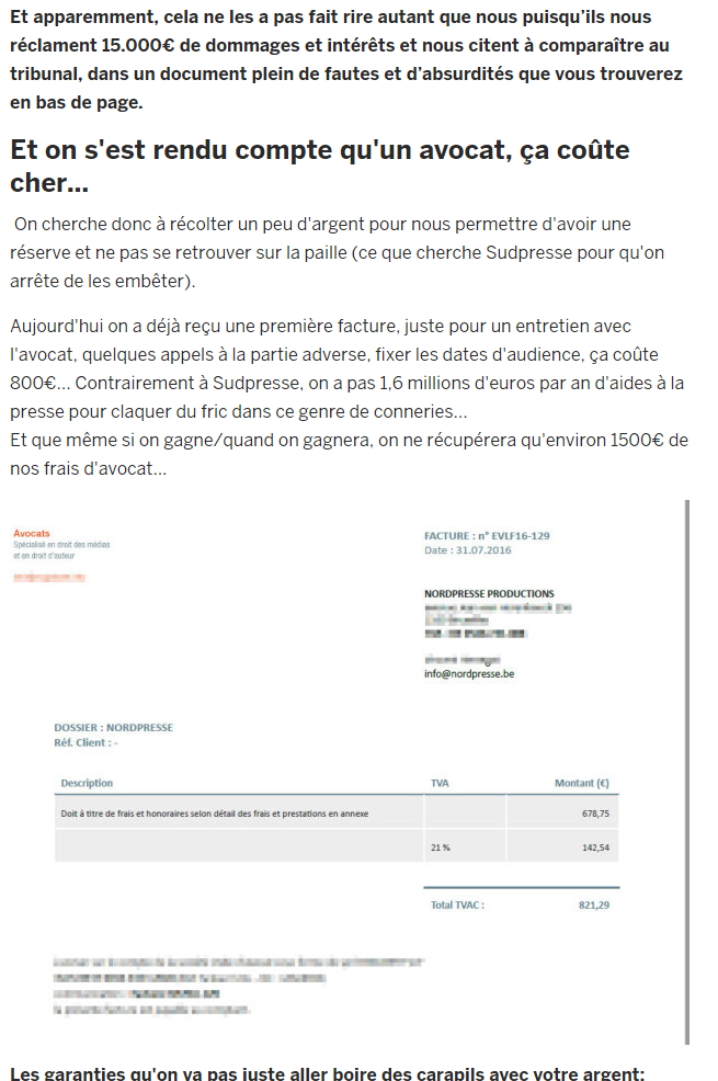 ![]() Le journal SudPresse, intente un procès au journal NordPresse. (ceci se passe en belgique évidemment :lolhit:) L'explication est très bien faite sur la plateforme de crowfunding, je la remet ici (en partie parce que sinon on va me prendre pour un fou :lol: bon je mets tout au final pcq c'est pas si long, et la suite est la citation à comparaître, donc du baratin d'huissier )Participez à payer le procès Sudpresse contre Nordpresse ![]() ![]() ![]() Le site de crowfunding Le FB de NordPresse