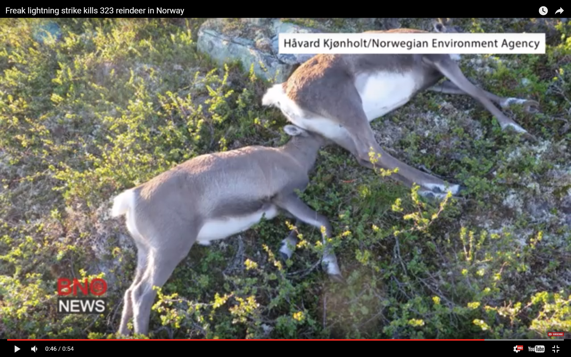 Freak lightning strike kills 323 reindeer in Norway Citation : Une scène apocalyptique. Plus de 300 rennes sauvages sont morts foudroyés dans le sud de la Norvège, a-t-on appris lundi 29 août auprès des autorités norvégiennes. Une hécatombe sans précédent dans le pays. Les 323 cervidés, dont 70 jeunes, ont été retrouvés peu avant le weekend par un garde-chasse sur le plateau du Hardangervidda, un parc national du pays où vivent près de 10.000 rennes à l'état sauvage. Norvège : 323 rennes meurent simultanément foudroyés