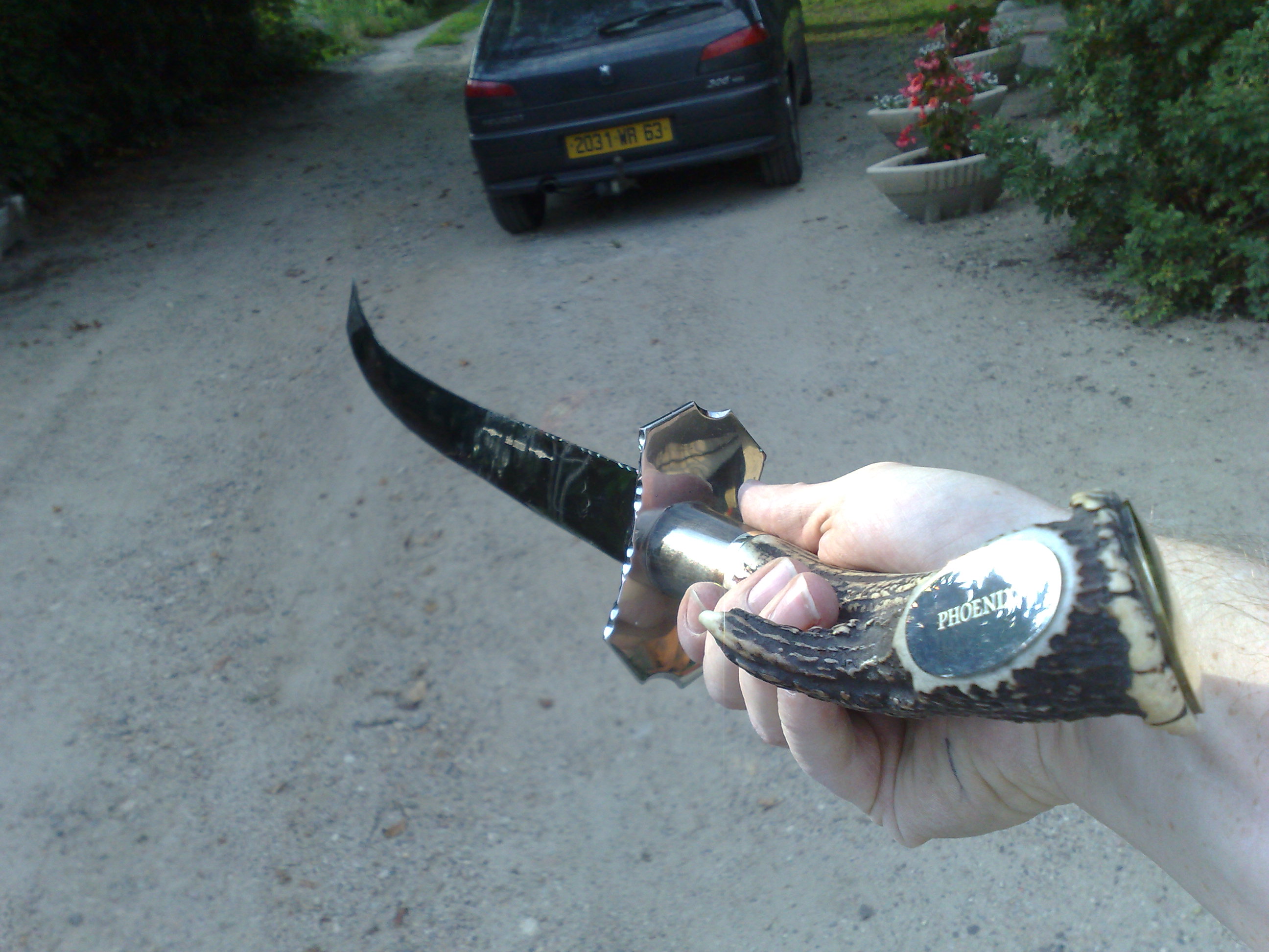 ![]() ![]() ![]() ![]() Quand j'étais arpète j'étais polisseur de couteaux professionnels et je travaillais avec un papy qui me montrait des bricoles et au bout d'un an déjà je faisais des trucs comme ça ![]() et ce sabre avec lequel j'ai gagné a l'époque une mention spéciale au concours nationale de la sema ![]() ![]()