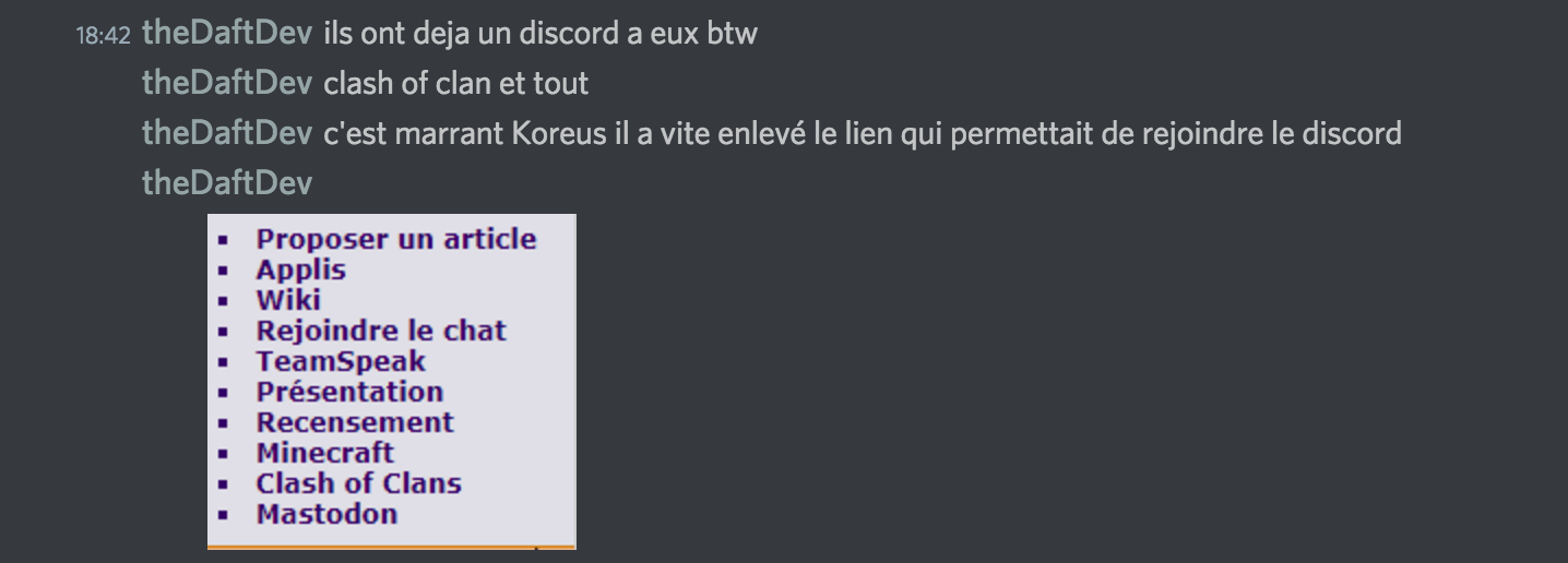 ![]() ![]() ![]() ![]() ![]() ![]() ![]() Le lien n'a jamais été présent. Quand je vous dis que vous vous inventez des trucs, pire que les complotistes. ![]() Votre Discord est nauséabond. Pensez à balayer devant votre porte avant de nous faire la morale
