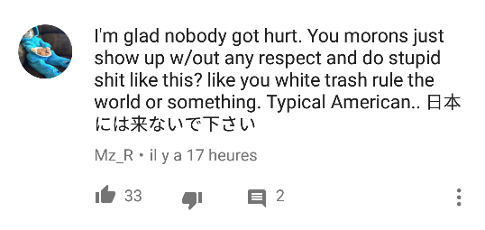 Ahah, en effet, ces Japonais(es), tous les mêmes. C'est comme leurs caractères, c'est du Chinois tout ca..!!.. Ah, non, c'est du Japonnais. (Désolé, je ne pense pas que tu l'ai fait exprès.) Et sinon, ma question était réel - surtout que les commentaires Youtube Bug chez moi.. Dans les commentaires, c'est des insultes, mais des 2 côtés, voir plus des Américains. Exemple: ![]() ![]()