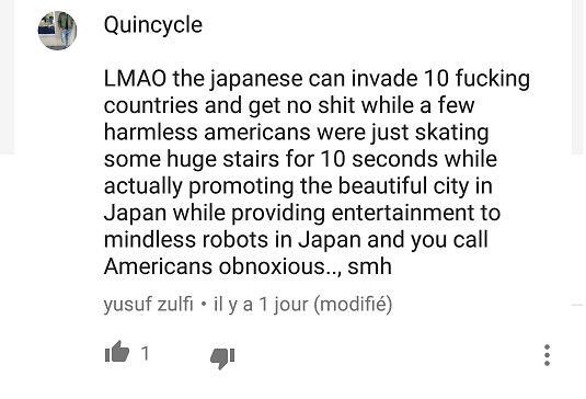 Non, c'est de la mise en danger et du manque de respect des autres. Le service d'ordre n'est clairement pas à la hauteur du danger. Le prochain titre, sera : "Une Japonaise gène un skateur pro dans son saut". (Le titre de l'équipe s'en rapproche :Aaron jaws homoki evite de justesse une femme en sautant 20 marches au japon.) Ca aurait pu être un gamin qui courait sur le trottoir!! Autant son saut sur Lyon, il ne gênait personne, autant là, c'est un c*n. C'est comme s'arrêter au milieu de l'autoroute, faire un bouchon pour se prendre en photo. PS qui a des exemples de commentaire Youtube Raciste (Sur la vidéo bien sure, et si possible plus d'un, car c'est facile de trouver des racistes sur internet !!)?