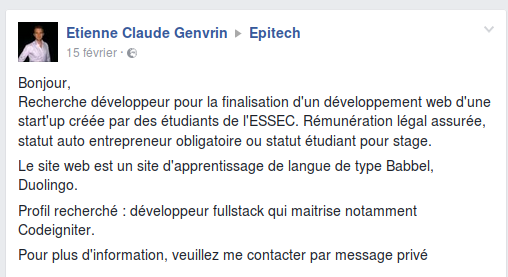 Le profil recherché suffit amplement à démontrer qu'il ne comprends pas un traître mot de ce qu'est Epitech et le fonctionnement de son produit.