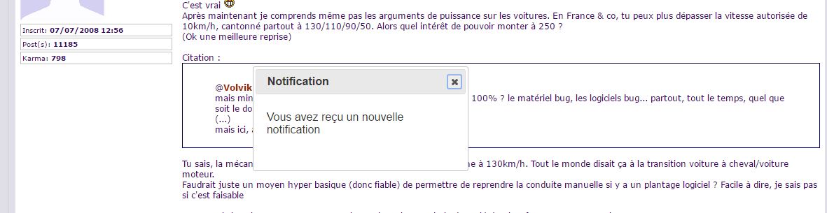 Propositions : - Afficher la notif de notif dans le menu de gauche ? (En permettant le deplacement de ce menu pour qu'il nous suive ?) - Et/ou mettre une notif directement dans l'onglet de la page internet ? (je sais pas si c'est possible en fait) La fenêtre de notification : ![]() (Pour ceux qui n'auraient pas encore vu ca)