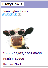 | Je poste trop    Inscrit: 18/05/2005 11:50 Post(s): 13516 Karma: 2177 | @CrazyCow  wouah tu as fait fort 400 personnes, impressionnant   Toujours un plaisir de te croiser, je ne fais jamais de dédi, je vais oublier des pseudos a coup sûr  la grosse bise