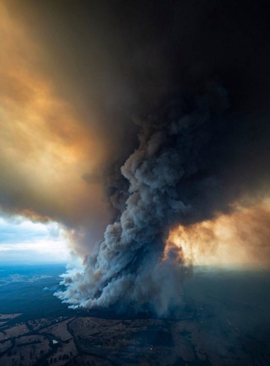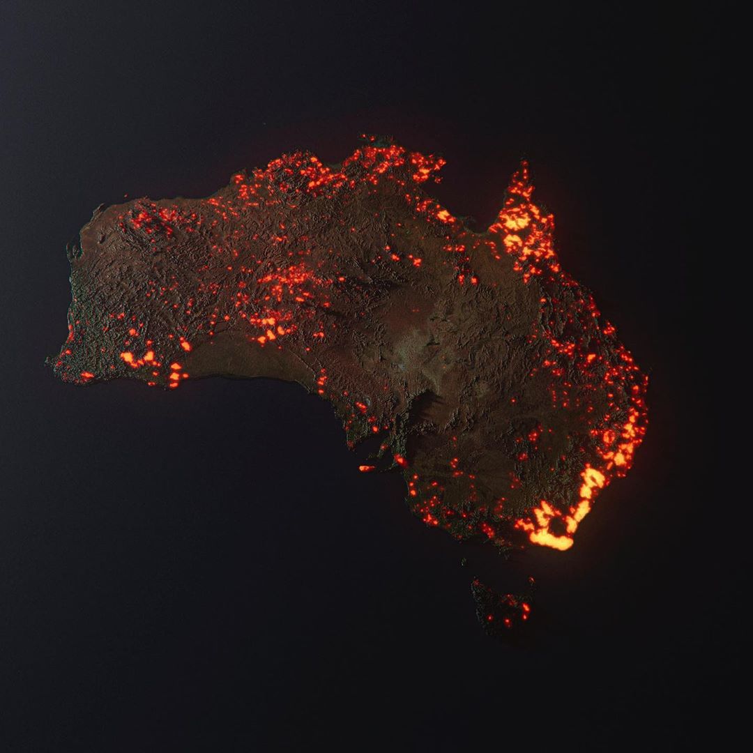 ![]() Vue d'artiste en modélisation 3D montrant l'étendue de tout les incendies en Australie depuis septembre à partir de données satellite. Note : les incendies montrés sur l'image ne sont pas toujours en cours, certains sont en effet éteint désormais. Bien que ça reprenne des données réelles en terme de surface, ça reste éxagéré en couleur, etc. ![]() Source : https://www.instagram.com/p/B67bRtPnVzR/?utm_source=ig_web_button_share_sheet