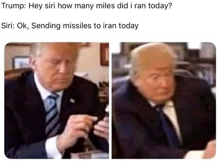 ![]() Trump : Hey Siri, j'ai couru combien de miles aujourd'hui ? Siri : OK, je lance des missiles vers l'Iran aujourd'hui.