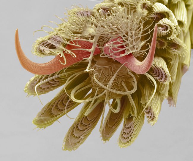 1) Une larme humaine ![]() 2) Section en plumes de paon ![]() 3) Embryon d'araignée ![]() 4) Les écailles des ailes d'un papillon (Urania ripheus) ![]() 5) Un acarien sur le dos d'une abeille ![]() 6) Œil de mouche ![]() 7) Tissu mammaire en lactation: sphères remplies de lait (rouge) entourées de minuscules cellules musculaires qui expulsent le lait (jaune) et de cellules immunitaires (bleu). Si vous l'aviez celui-là, vous êtes bizarre. ![]() 8) Cristaux d'acides aminés ![]() 9) Soixante-cinq zooplancton soigneusement arrangés à la main dans un style victorien, trolololo ![]() 10) Une patte de moustique, grossi 800 fois au microscope électronique à balayage ![]()