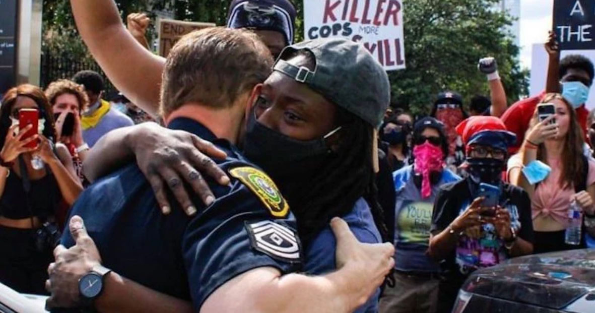 Un cordon de manifestants protège un policier séparé de son unité ![]() Un check entre un afro-américain et un policier ![]() Un manifestant enlace un policier ![]() Un policier enlace une manifestante ![]() Des manifestants protègent un commerce des pilleurs ![]()