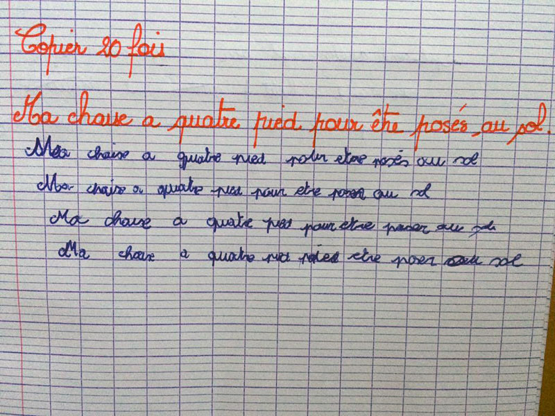 ![]() :-o @Geo-graphic La phrase de l'institutrice. La phrase aurait du être : "Ma chaise a quatre pieds pour être posée au sol." Pas très classe...