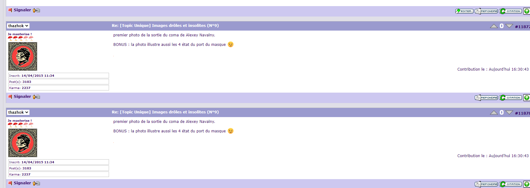 BONUS : la photo illustre aussi les 4 état du port du masque ![]() EDIT: alors de une pourquoi mon message et doublé et de deux c'est toujours la m*** avec cet salo@#£! de ".webp" qui ne passe pas sur koreus (d'ailleurs pourquoi ça merdouille à ce point ???????) ![]() @Avaruus laisse moi au moins 20 sec pour répare l'image, espèce de ... jeune ! l’image invalide ne l'était pas sur la prévisualisation, comme dis plus haut les ".webp" merdeouille sur koreus. Donc pas si invalide que ça. D'abord ! na ! prout ! et pour le double post, j'y comprend rien, j'ai validé mon message et rien d'autre ... (et ton ppf n'affiche rien non plus .... ta l'air encore plus fin de moi finalement )