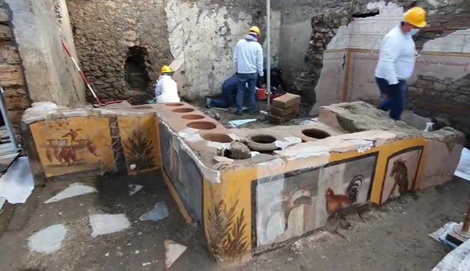 ![]() ![]() ![]() ![]() ![]() ![]() ![]() ![]() ![]() Une nouvelle découverte archéologique exceptionnelle à Pompeï: un "thermopolium", cet ancêtre du fast-food, découvert dans un état de fraicheur incroyable. Les fresques évocatrices sont juste magnifiques. Et dans les pots, des restes de plat chaud servi aux clients, comme cet étrange ragoût de mélange de chevreau, poisson, escargot et d'oiseau ! Ou ce vin "corrigé" dans un dolium, par des fèves au fond du pot separé d'une brique, afin de blanchir le vin et corriger son goût. Enfin un squelette de chien de taille moyenne a aussi été trouvé derrière le comptoir ... Et au dessus de la fresque du chien de garde, une petite inscription très pompéienne: "Nicias, honteux chieur" dénonçant publiquement un "cacator" grec .Des amphores, une citerne et une fontaine, ainsi que des ossements humains, ont été découverts à proximité, notamment ceux d’un homme d’une cinquantaine d’années près d’un lit d’enfant. « L’échoppe semble avoir été fermée à toute hâte et abandonnée par ses propriétaires, mais il est possible que quelqu’un, peut-être l’homme le plus âgé, soit resté et ait péri au cours de la première phase de l’éruption, dans l’effondrement du grenier », a expliqué M. Osanna . L’autre corps pourrait être celui d’un voleur ou d’un fugitif affamé « surpris par les vapeurs ardentes avec à la main le couvercle du pot qu’il venait d’ouvrir », a-t-il ajouté. Source Ansa.It Copyright Luigi Spina Parc archéologie de Pompeï
