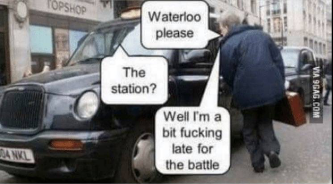 ![]() Waterloo svp. La gare? Ben je suis drôlement tard pour la bataille.