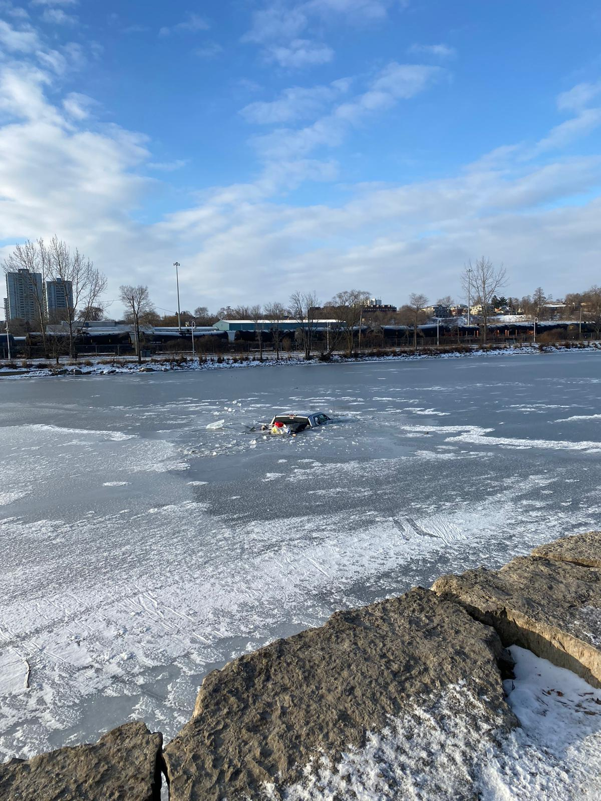 Lancé de voiture à partir d'un ponton de bateau. Un beau 100 mètres avant que la glace ne cède. Le conducteur ivre s'en est sorti.