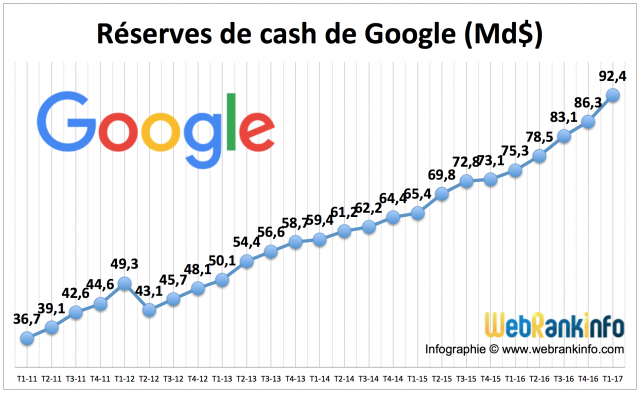 Au 31/03/2017 Google disposait de 92 Md$ de cash, soit près de 17 Md$ de + en 1 an !
