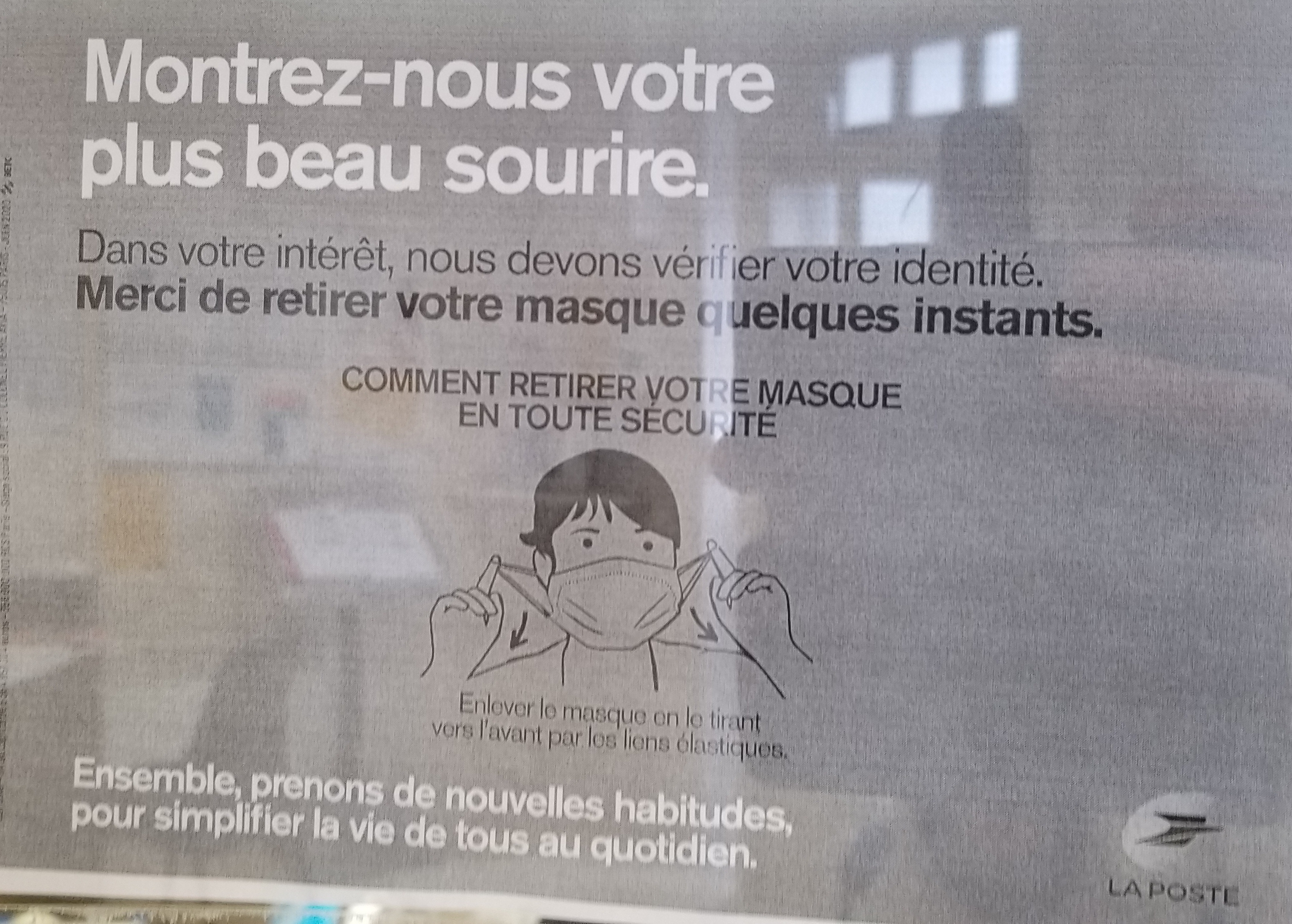 Photo perso. La poste nous explique comment retirer son masque. Moi qui croyais qu'il fallait couper les oreilles !