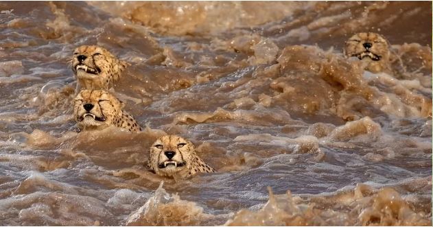 Nota:En vrai, des guépards traversent une rivière inondée,infestée de crocodiles dans la réserve naturelle de Maasai Mara au Kenya. Ils ont tous traversé sans être mangés.