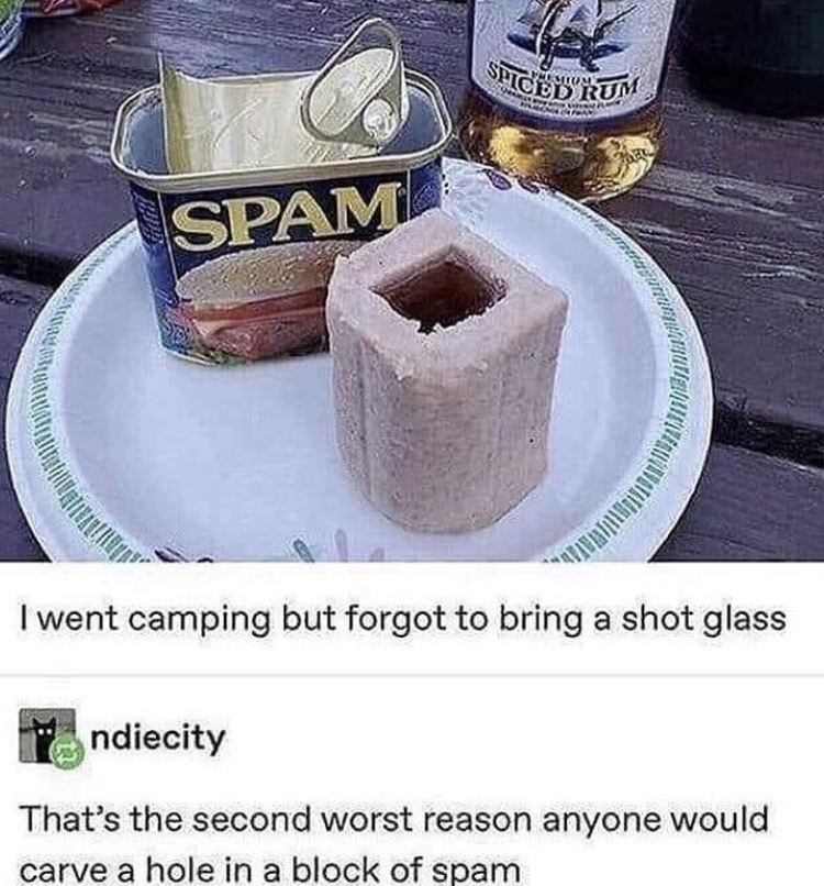 ![]() Traduction J’ai fait du camping, mais j’ai oublié d’emporter un verre à shot – C’est la deuxième pire raison de faire un trou dans un bloc de Spam Explication