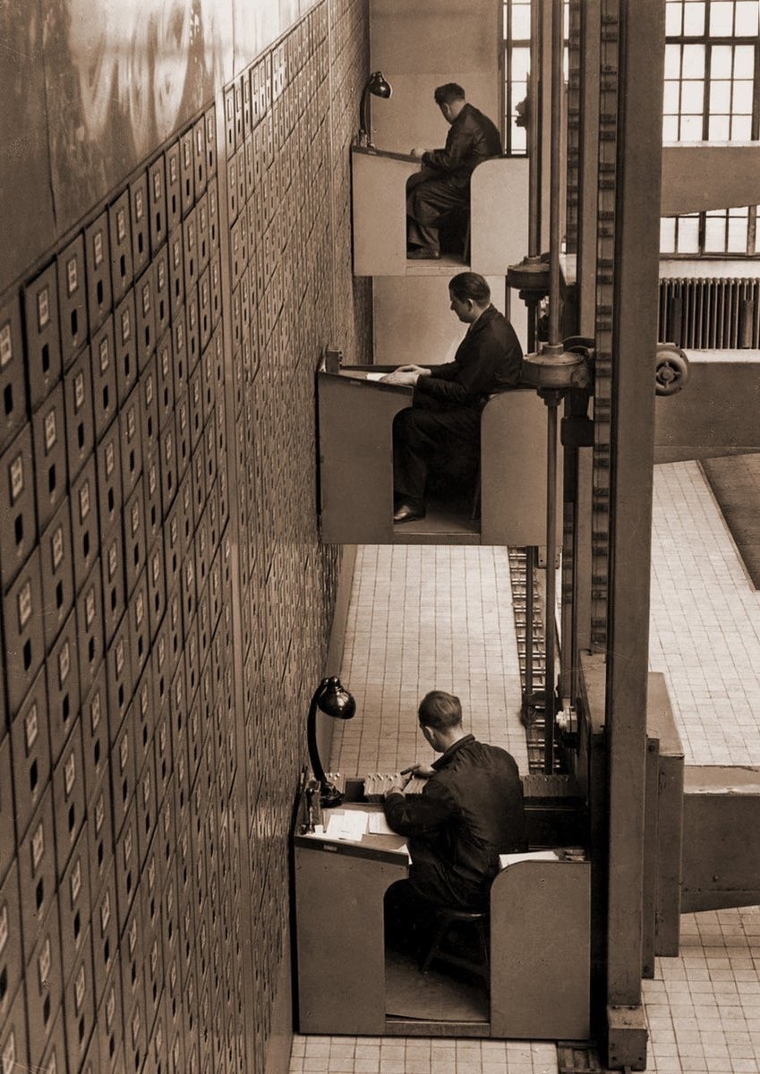 ![]() Une base de données en 1937 Le bâtiment des archives de l'Ústřední sociální pojišťovna est l'un des bâtiments administratifs de l'administration tchèque de la sécurité sociale à Prague. Ce système de stockage des données a été utilisé jusqu’en 2002. D’une longueur de 50 mètres et d'une hauteur de 8 mètres, il contenait 9 000 tiroirs. → Autres photos